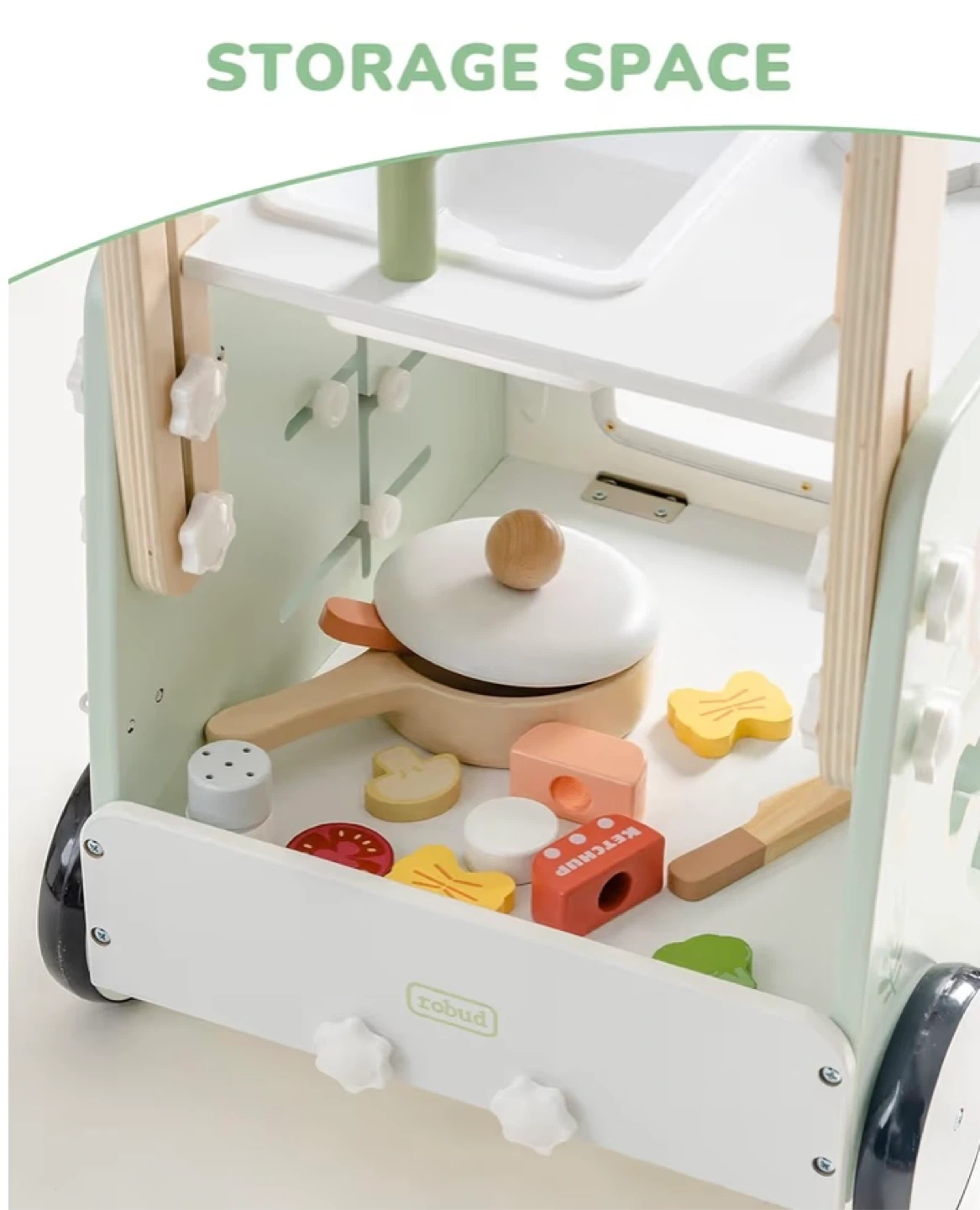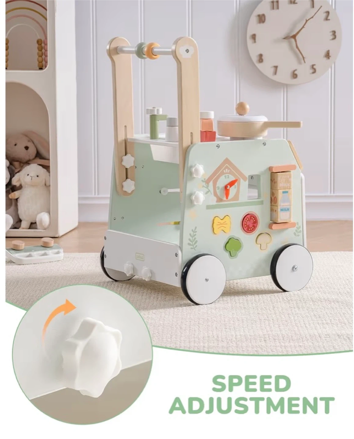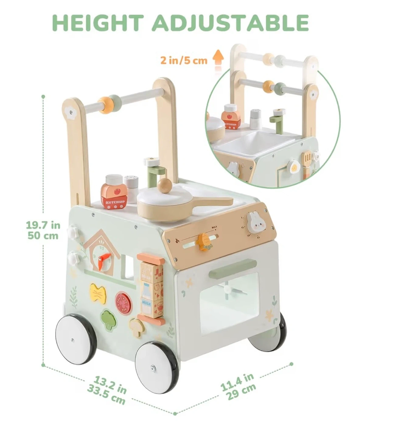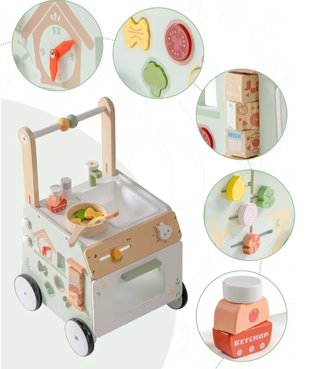 This wooden play kitchen walker is designed for little ones to explore. It's height adjustable for growing children. Includes various play accessories and interactive elements. Cash only, no e-transfers. Pick up only.