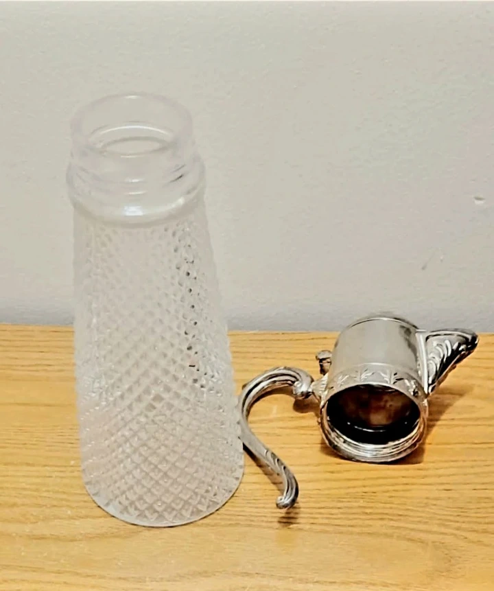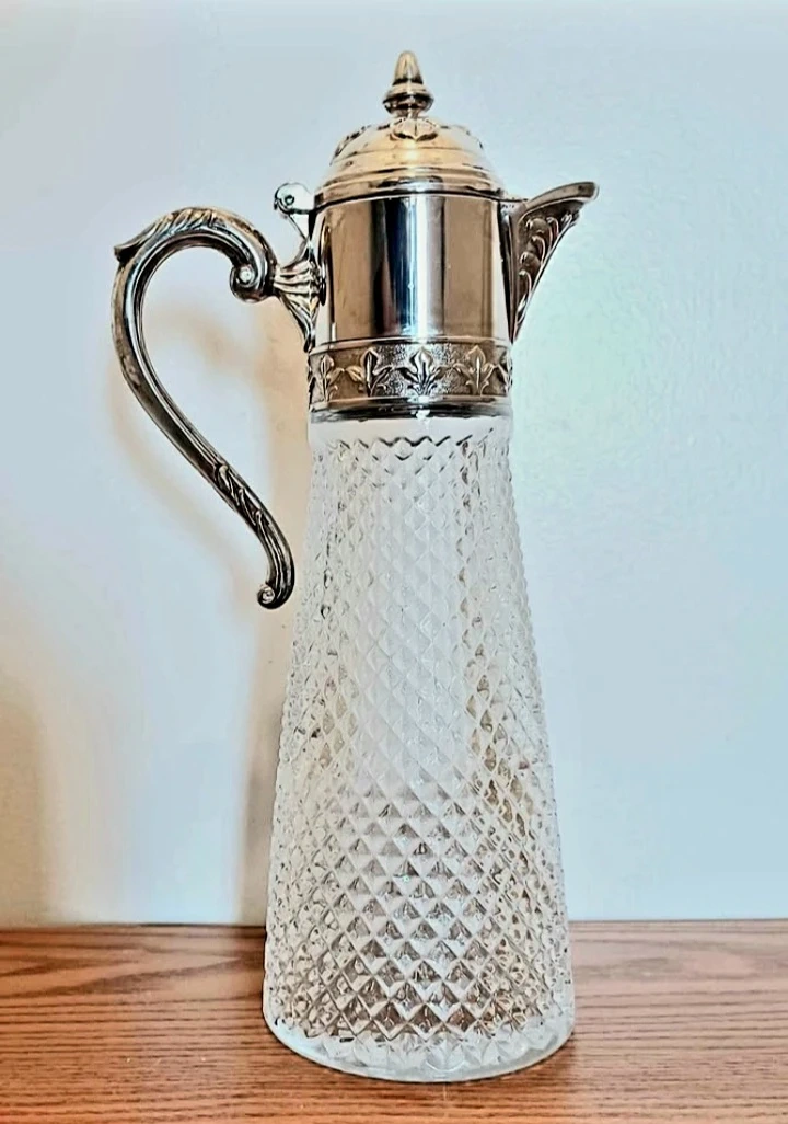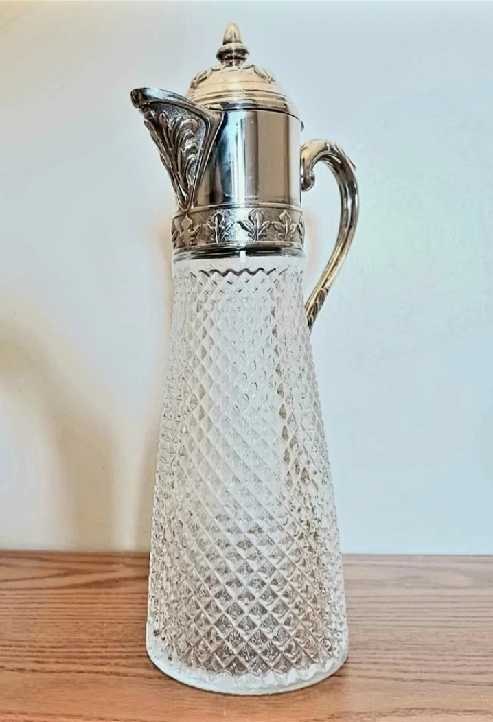 Vintage Italian Silver Plated Pitcher features a Stunning Diamond Hand cut Crystal body and an ornate silver plated top and handle.
