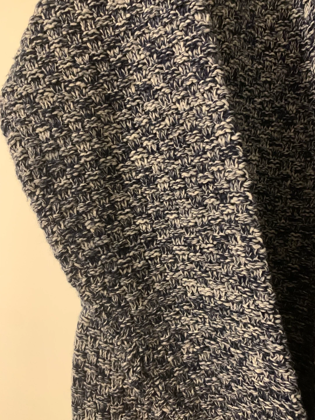 This is a long, open-front cardigan sweater. It's knitted with a marled navy and white pattern. Features two front pockets.
