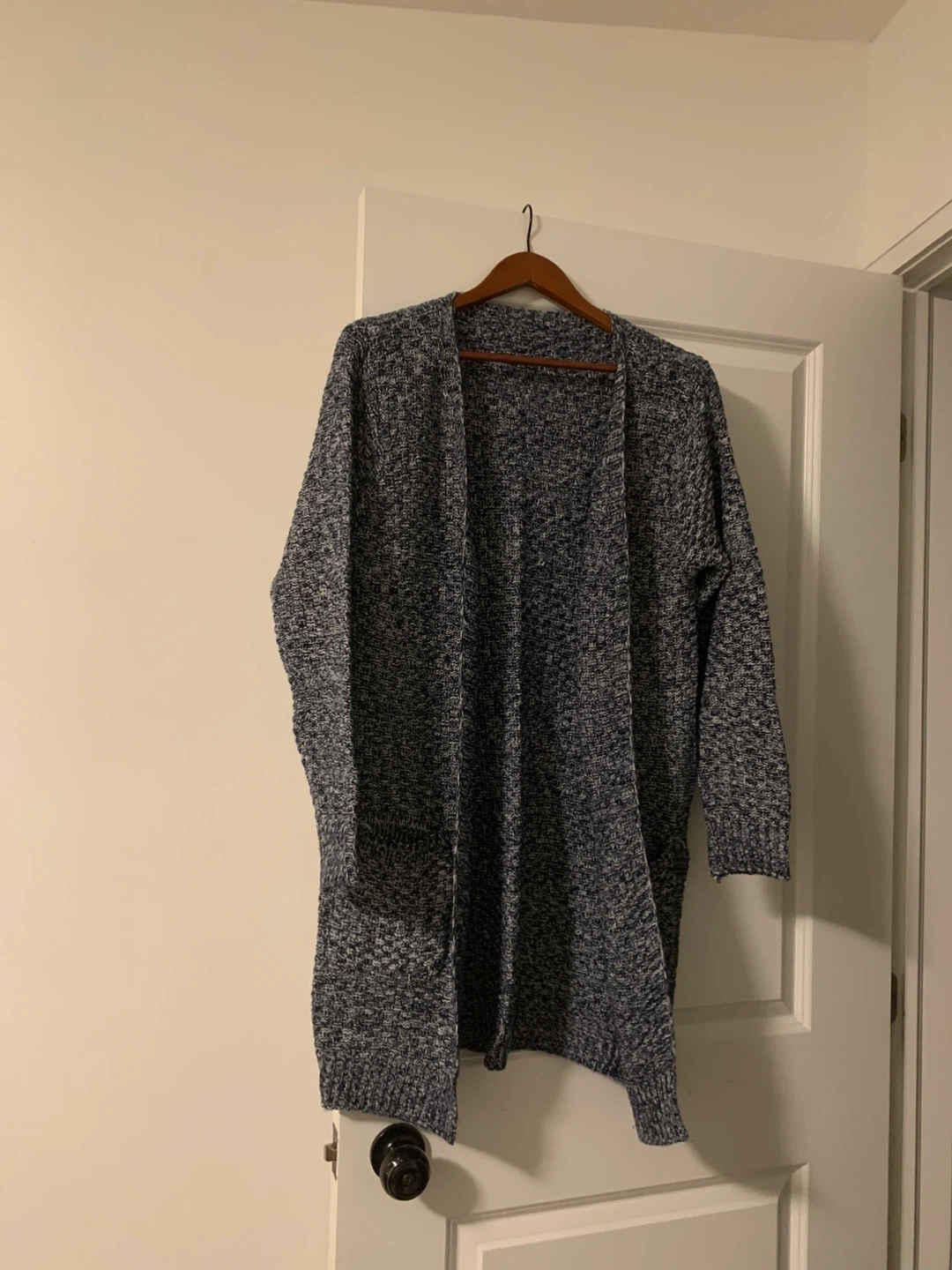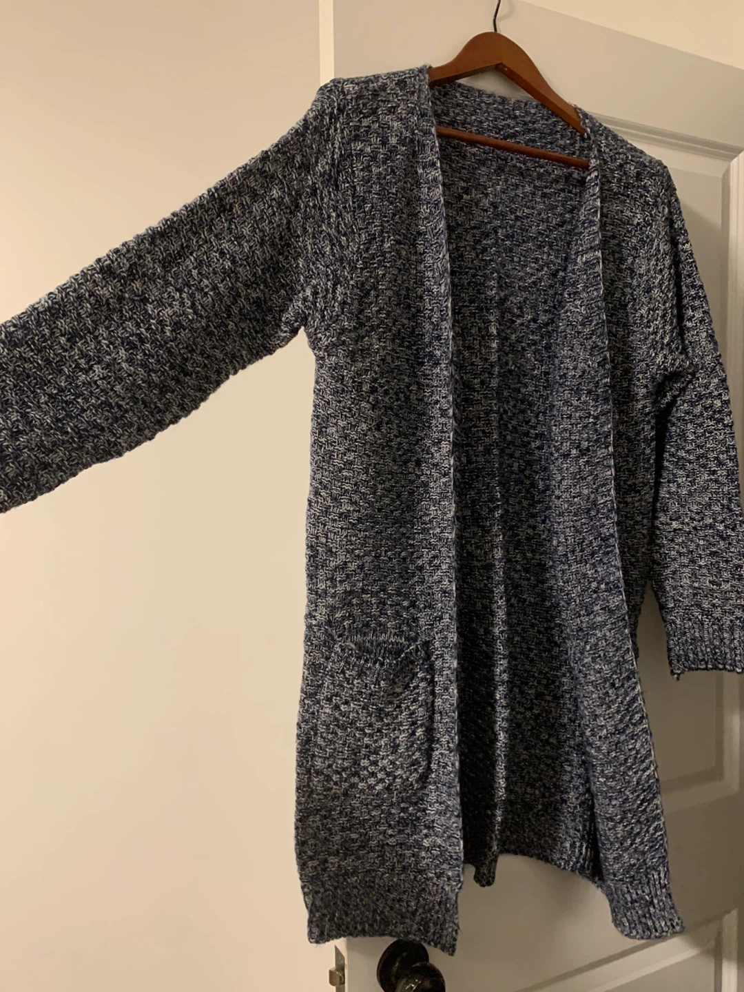 This is a long, open-front cardigan sweater. It's knitted with a marled navy and white pattern. Features two front pockets.