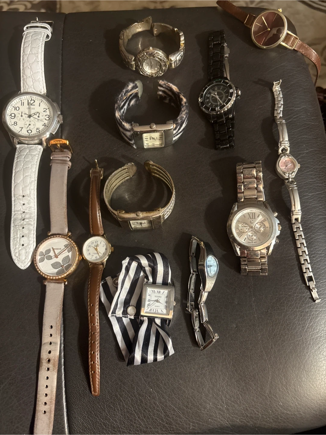 A collection of various women's watches. Includes a Fossil watch with a floral design and a white Guess embossed strap, as well as other styles with metal and fabric bands. Some watches show signs of wear, and functionality may vary.