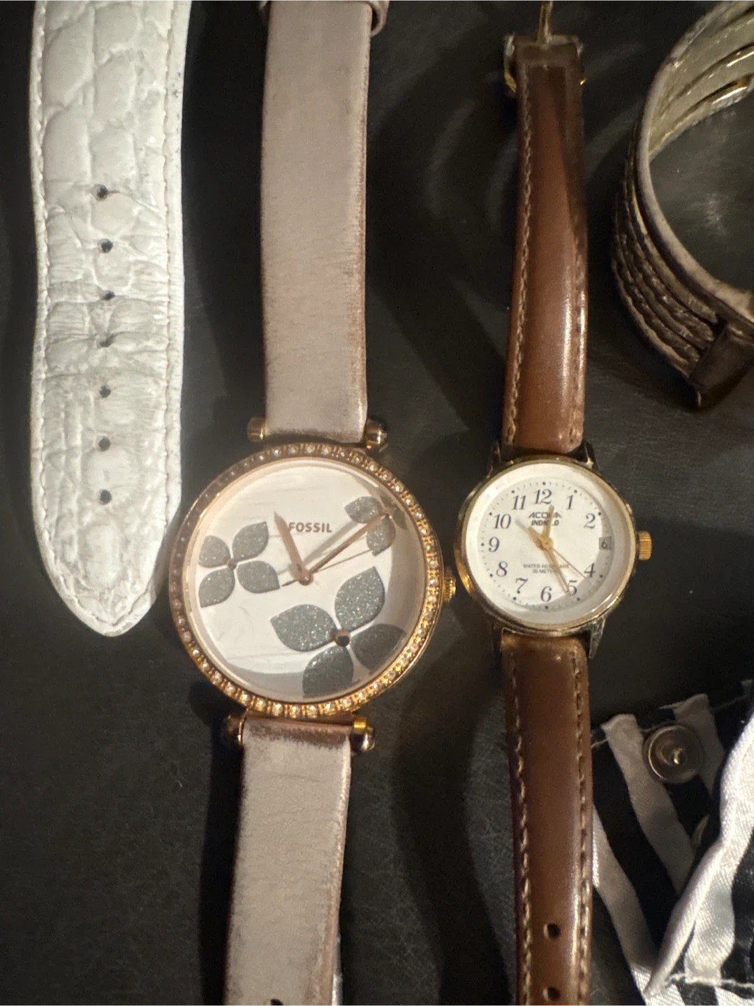 A collection of various women's watches. Includes a Fossil watch with a floral design and a white Guess embossed strap, as well as other styles with metal and fabric bands. Some watches show signs of wear, and functionality may vary.