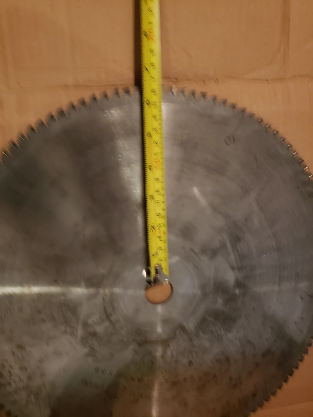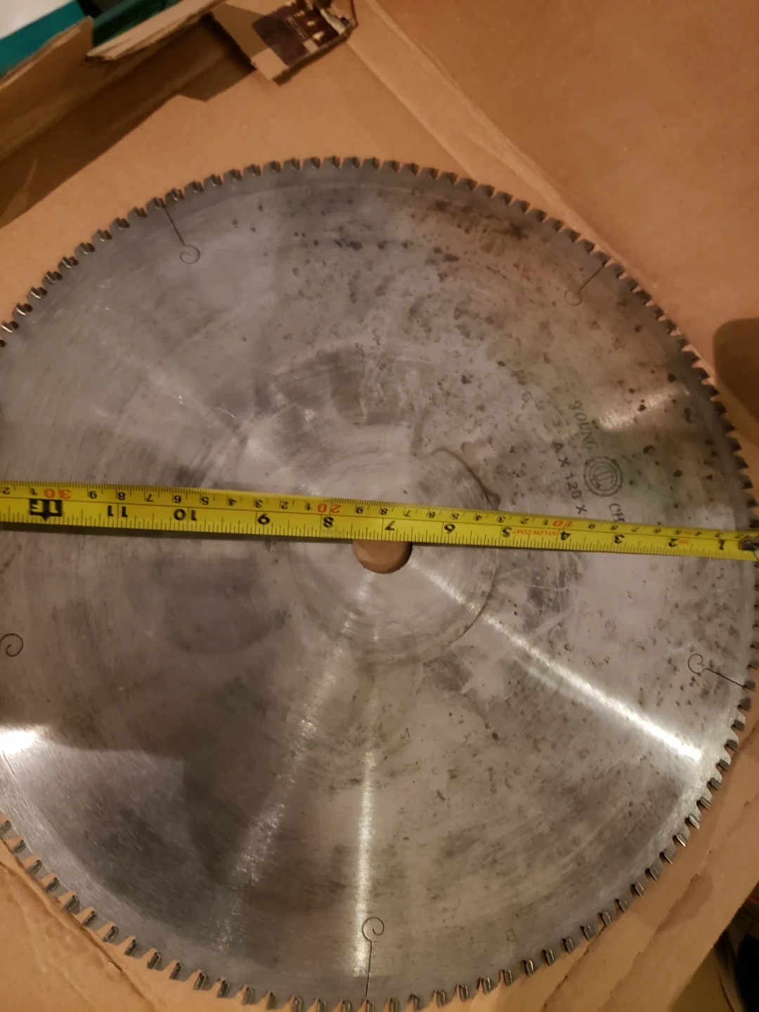 This is a circular saw blade with a 12-inch diameter. It has a 3.0 thickness and A X 120 bore. It's made of metal. This blade is for cutting aluminum...only cash 💸
