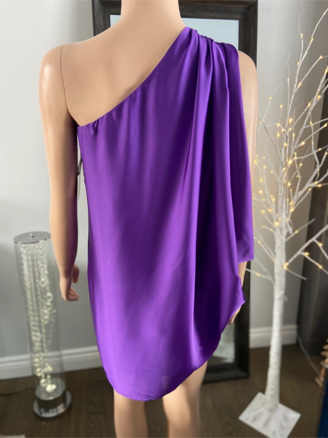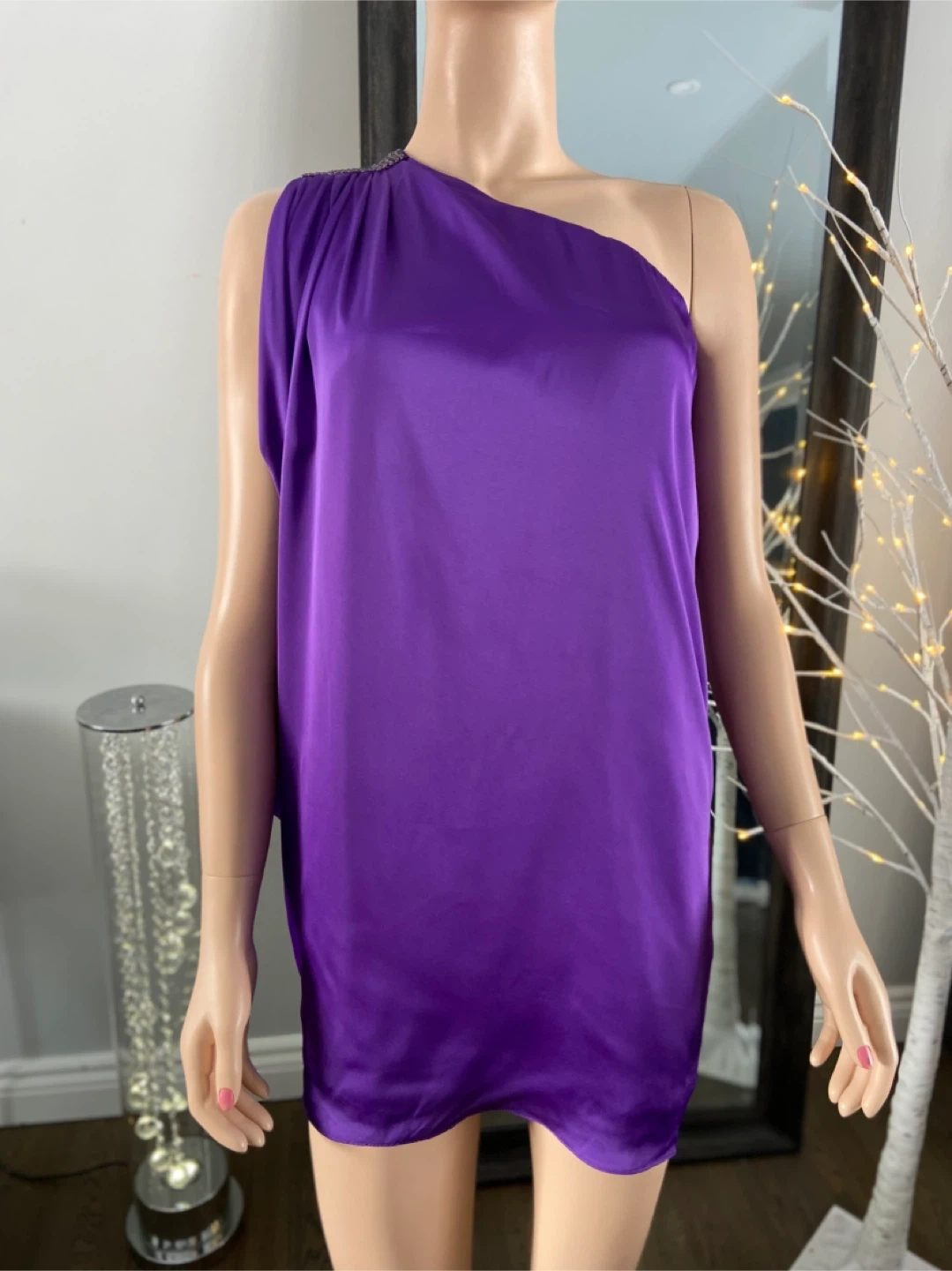 This stunning purple mini dress features a stylish one-shoulder design with elegant embellishments on the shoulder (additional beads attached). It's crafted from a smooth, satin-like material for a chic look and feel. Perfect for a night out or special occasion!