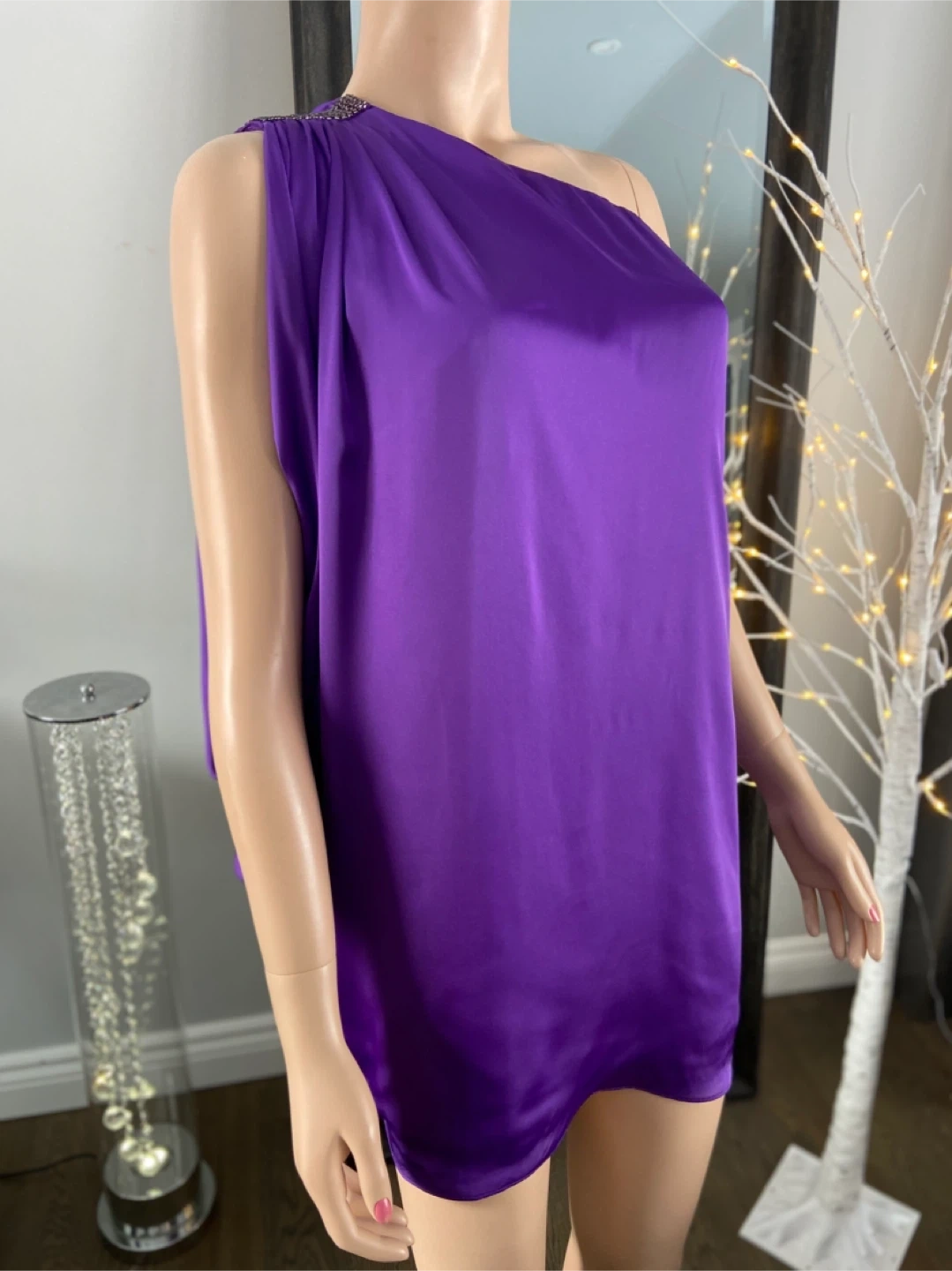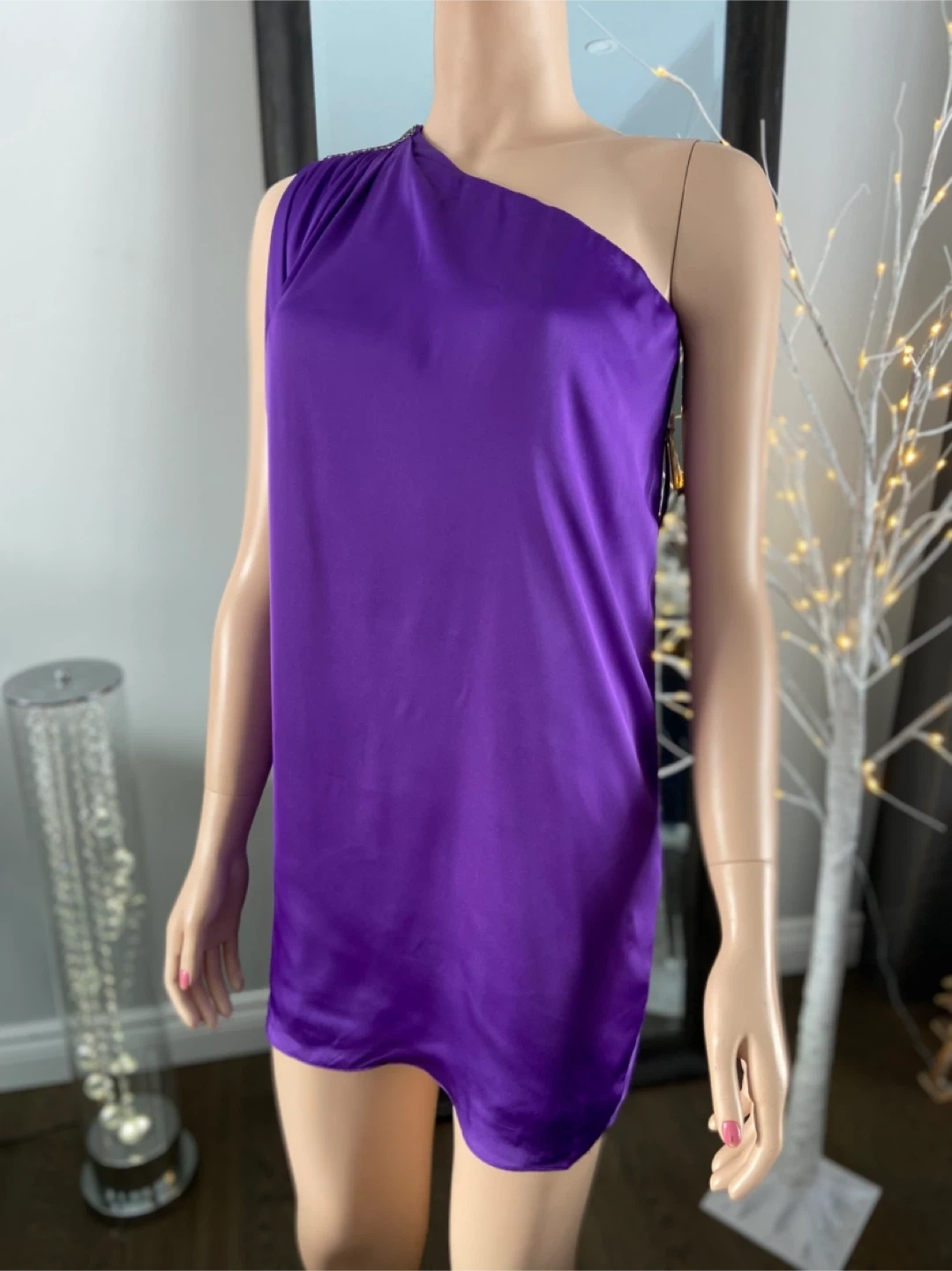 This stunning purple mini dress features a stylish one-shoulder design with elegant embellishments on the shoulder (additional beads attached). It's crafted from a smooth, satin-like material for a chic look and feel. Perfect for a night out or special occasion!