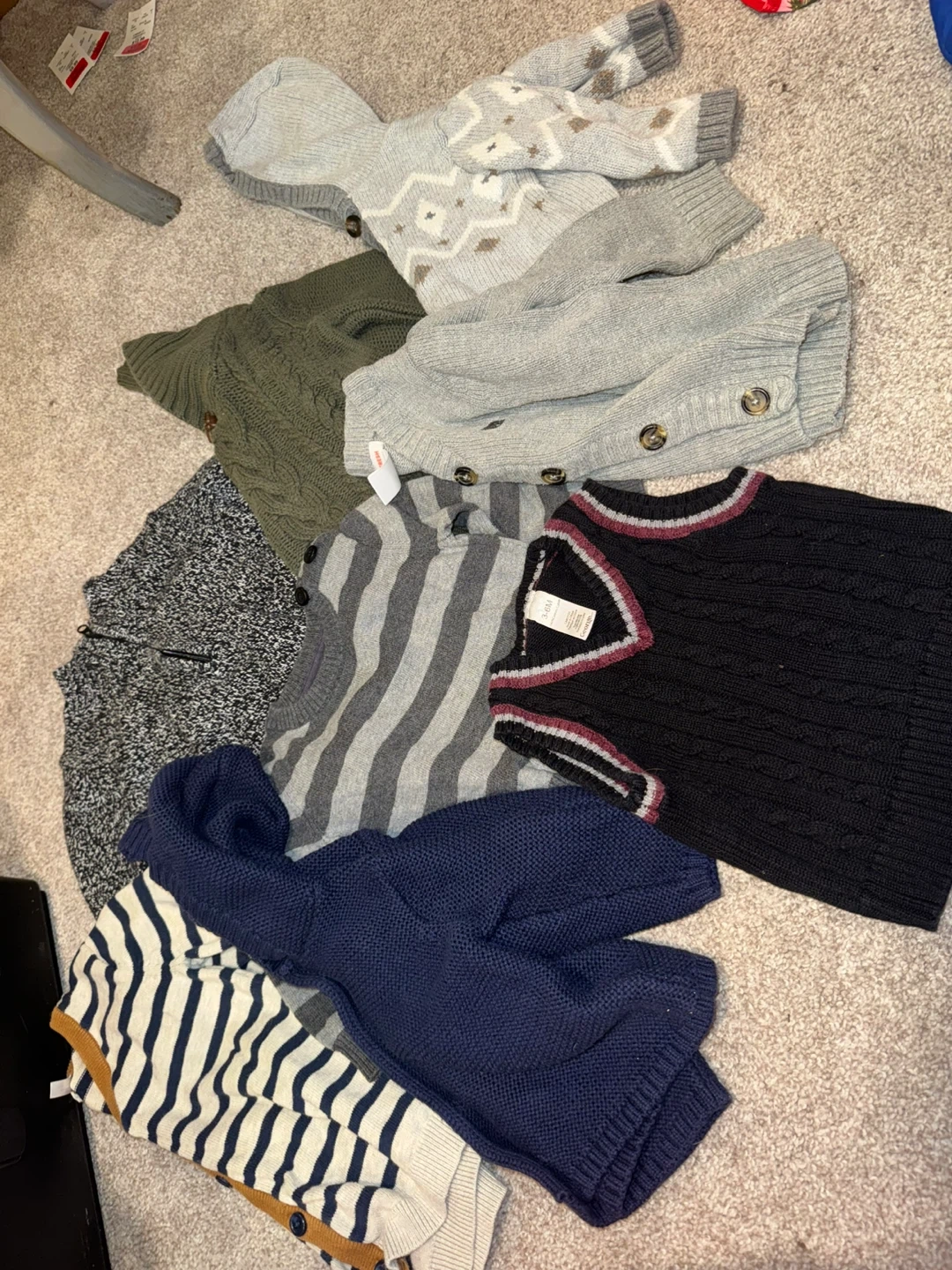 Includes: 12x bottoms, 8x sweaters, 6x flannels, 17x shirts, 1x vest and bow tie, 1x snow suit, 3x overalls, 2x slippers, 2x sleep sacks, 18x onesies, 7x sleepers