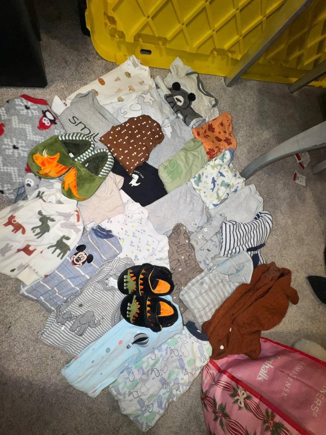 Includes: 12x bottoms, 8x sweaters, 6x flannels, 17x shirts, 1x vest and bow tie, 1x snow suit, 3x overalls, 2x slippers, 2x sleep sacks, 18x onesies, 7x sleepers