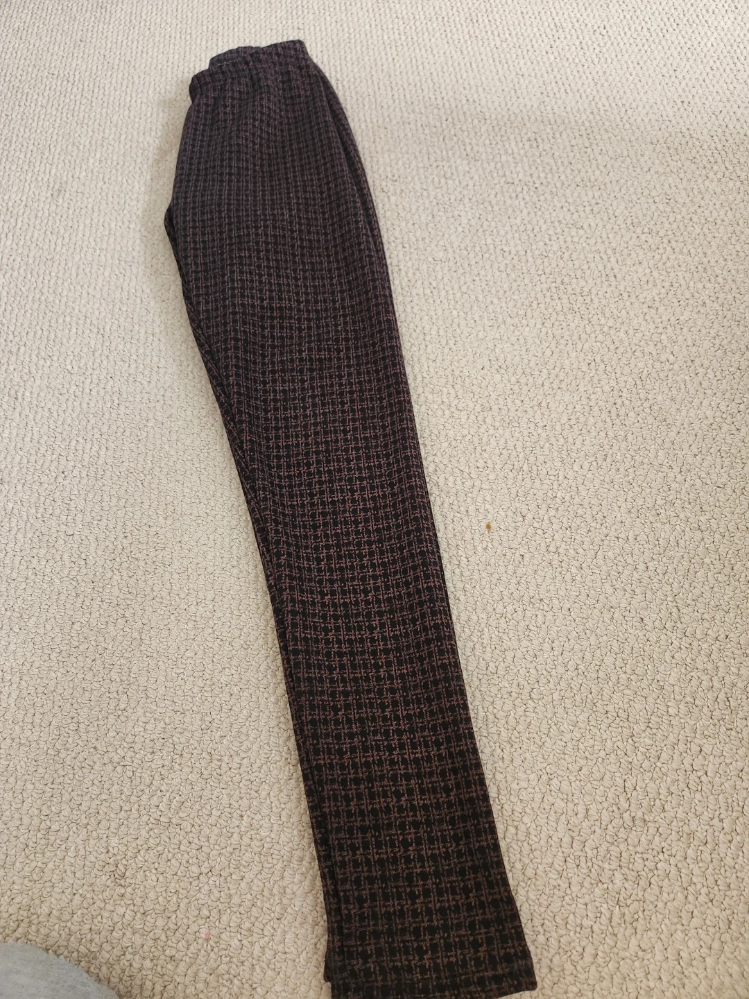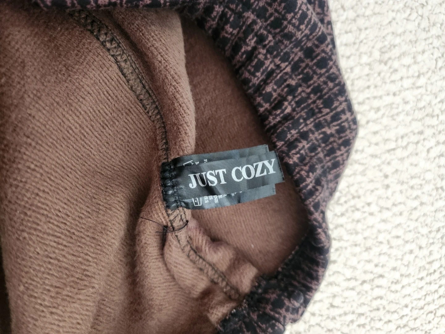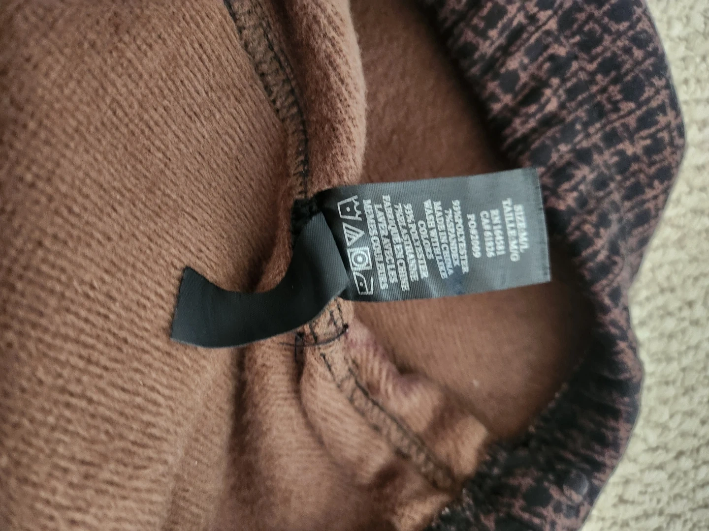 Cozy plaid lounge pants with a soft fleece lining. Size M/L. Made with 50% cotton and 50% polyester.