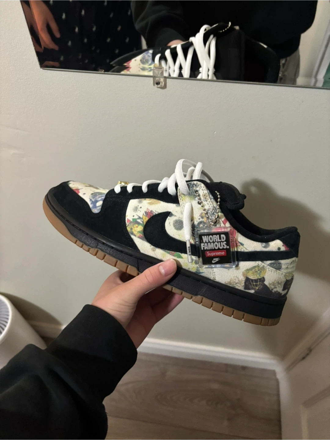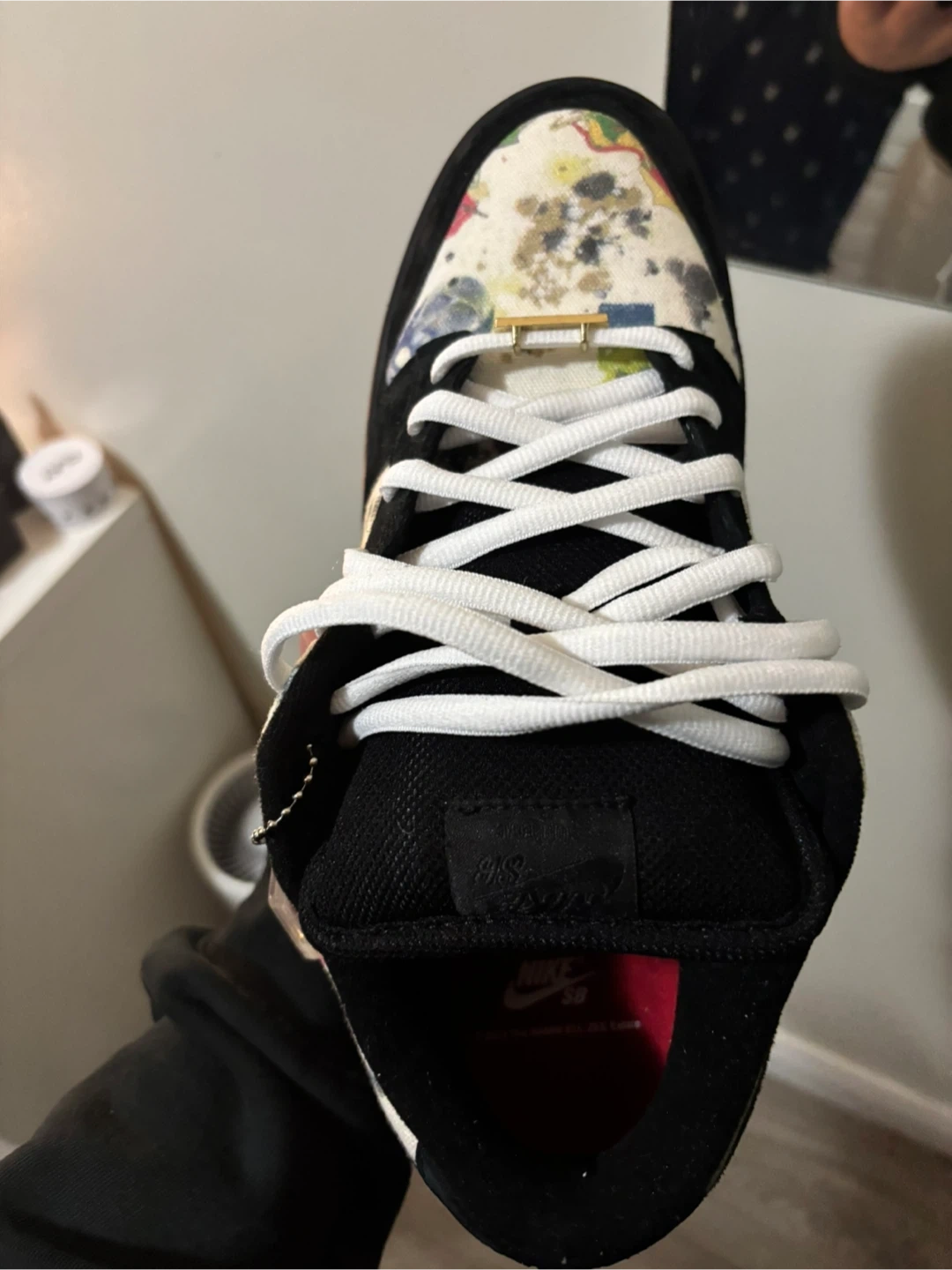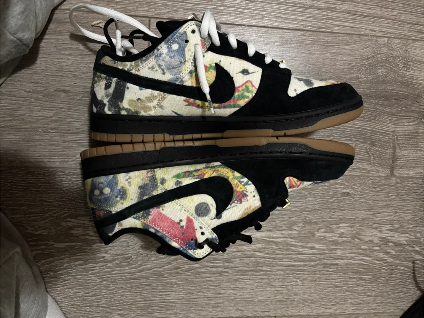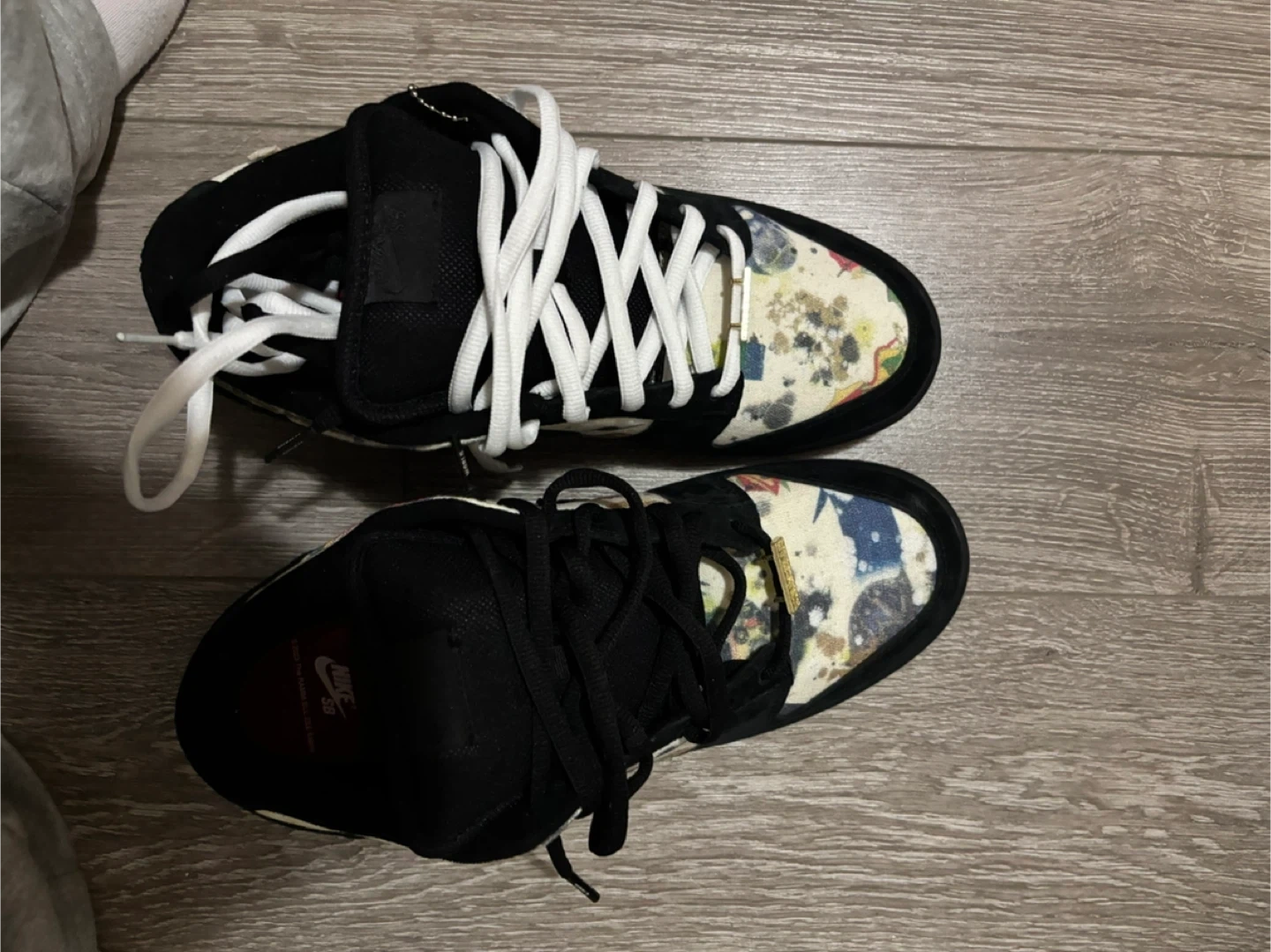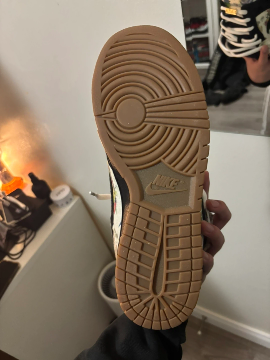 These Nike SB Dunk Lows feature a bold, artistic design with a mix of black suede and a colourful, abstract pattern. They have a durable gum rubber outsole and come with white laces. Perfect for collectors and skaters alike!