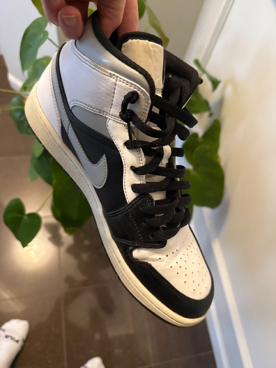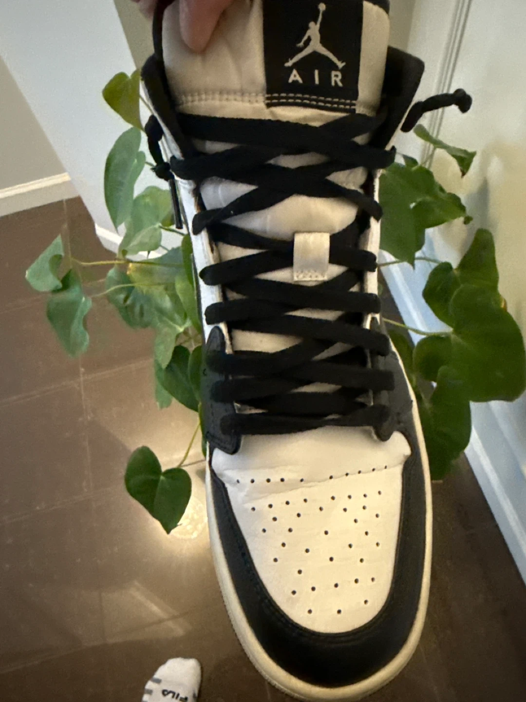 Classic high-top sneakers in white, black, and grey. Features the iconic Jumpman logo and Air cushioning. Lace-up closure for a secure fit. Brand new original Jordan