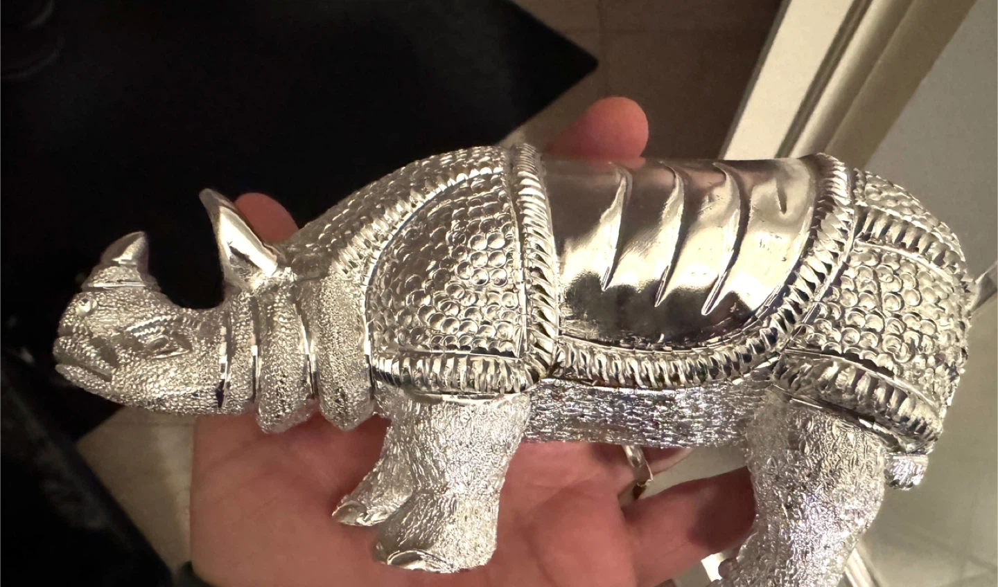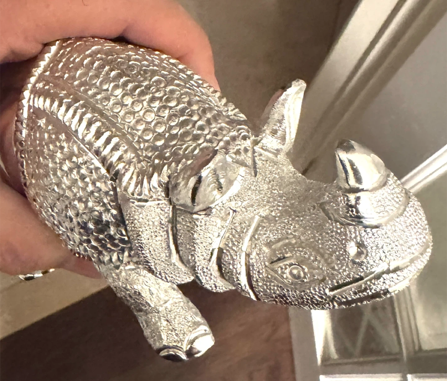 This is a decorative silver-tone rhinoceros figurine. It has a textured finish with intricate detailing across its body and armour plating. Great for adding a touch of unique style to your decor!