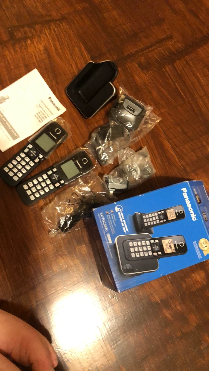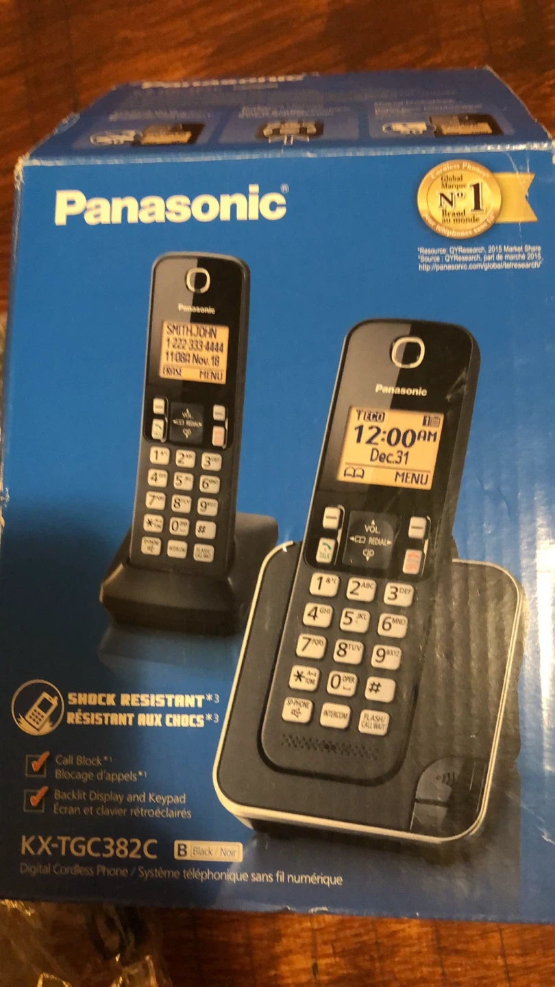 This is a Panasonic KX-TGC382C digital cordless phone system. It includes two handsets and a base unit with charging cradle. This system offers shock resistance and a backlit display and keypad.