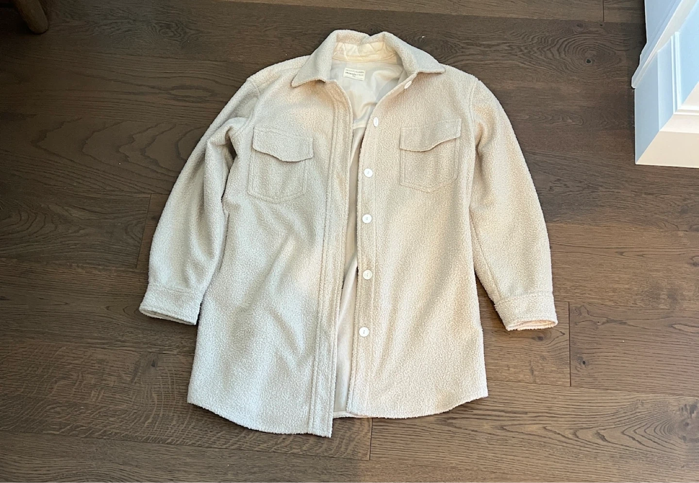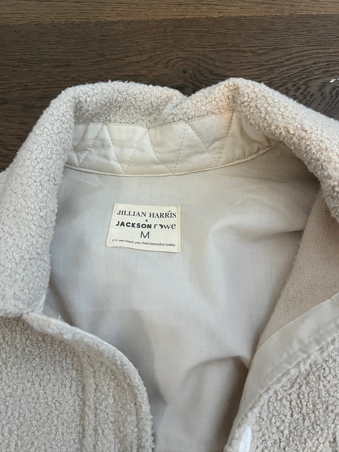 Cozy cream fleece shirt jacket by Jillian Harris Jackson Rowe. It's a size medium with embroidered heart details on the sleeves. Perfect for layering on cooler days! Size medium