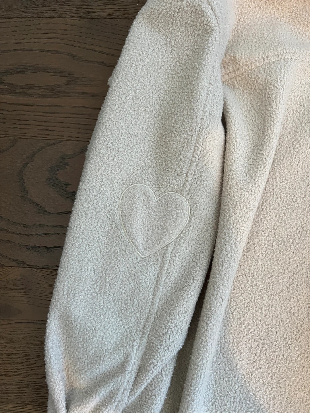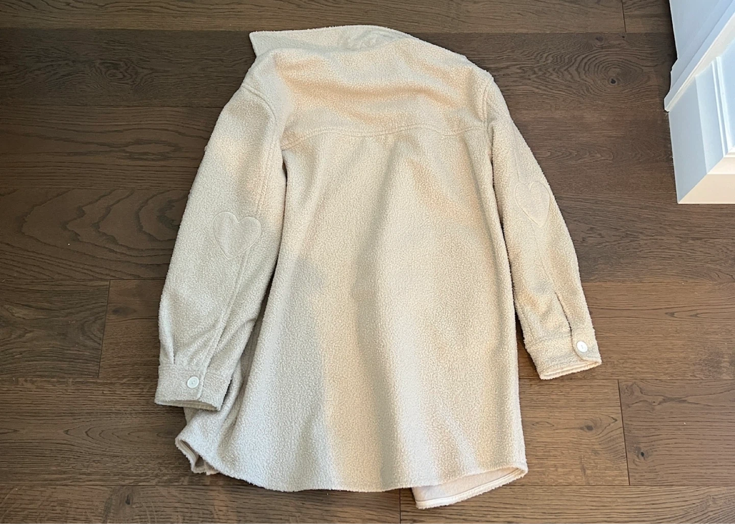 Cozy cream fleece shirt jacket by Jillian Harris Jackson Rowe. It's a size medium with embroidered heart details on the sleeves. Perfect for layering on cooler days! Size medium