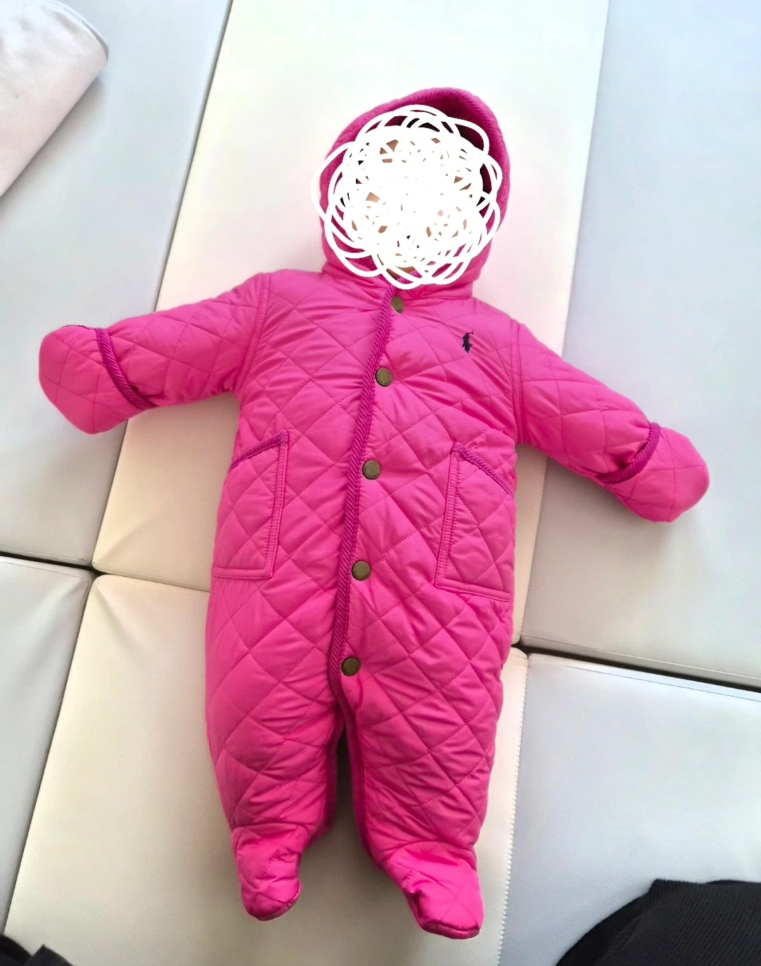 Bright pink quilted snowsuit from Ralph Lauren. Features a full snap-front closure and hood. Perfect for keeping your little one warm and cozy during cooler months!