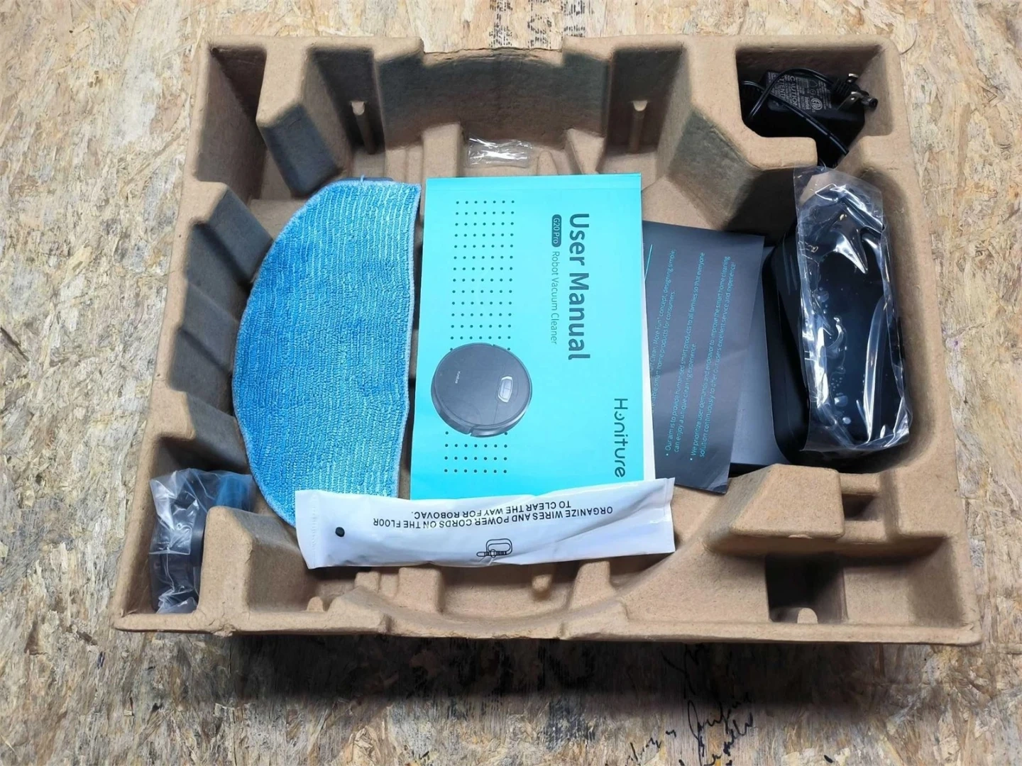 This is the Honiture G20 Pro Robot Vacuum Cleaner. It includes the robot, user manual, power adapter, and a mopping cloth. It's designed for cleaning your floors.