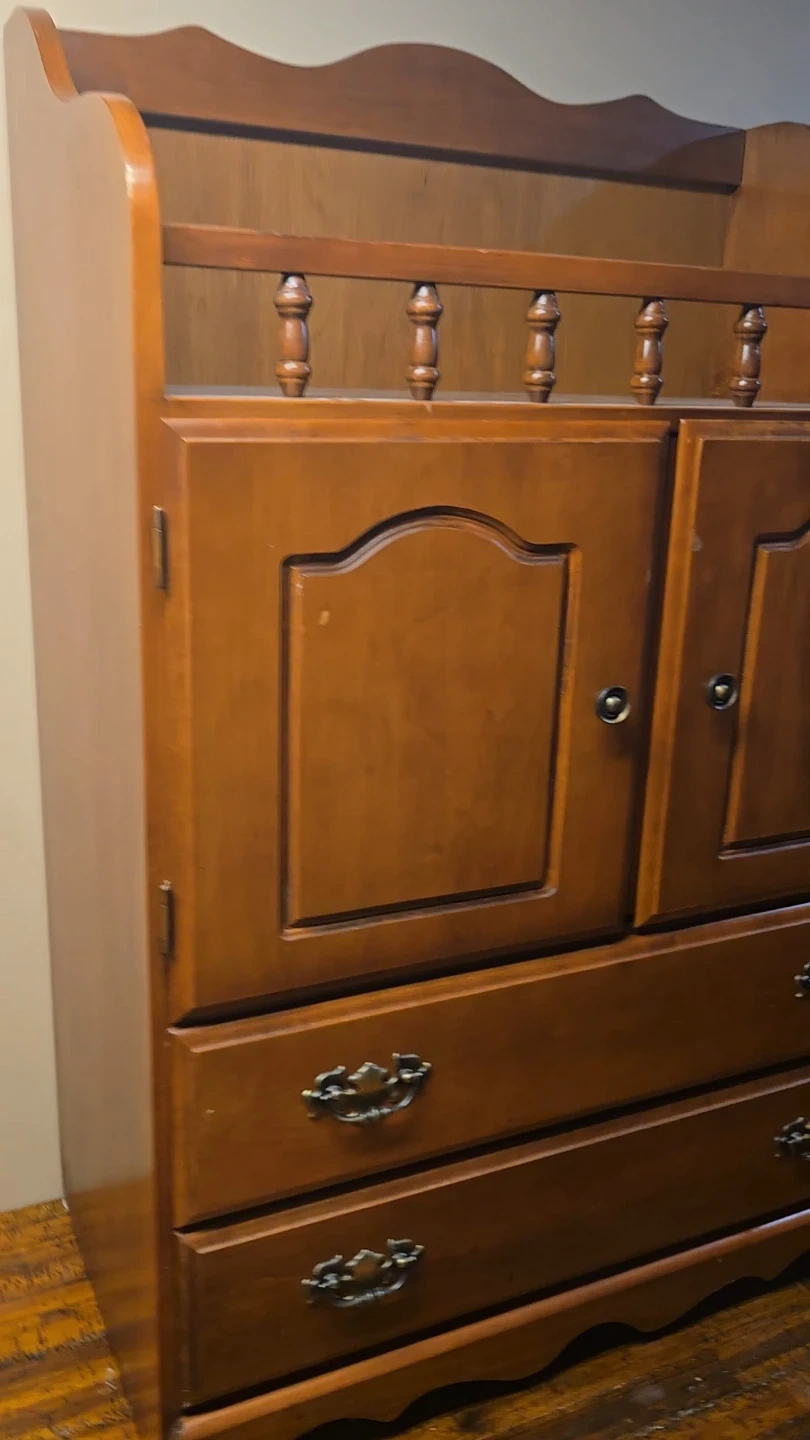 Solid wood armoire featuring two cabinet doors and three drawers. It has a decorative top rail and classic drawer pulls. This piece offers ample storage.