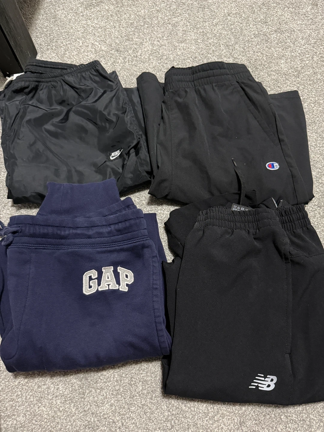 Four pairs of athletic pants from popular brands. Includes one black Nike pair, one black Champion pair, one navy GAP pair, and one black New Balance pair. All pants are black or navy. They're comfortable for workouts or casual wear.