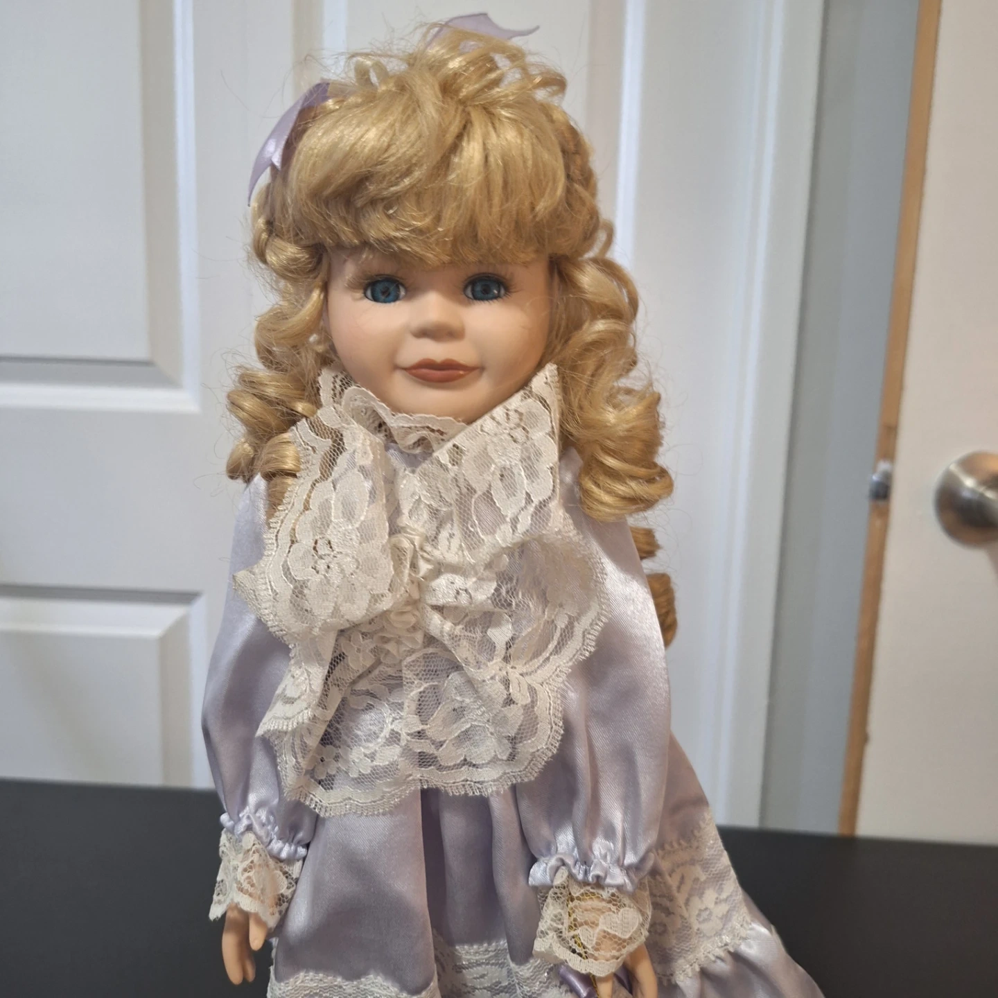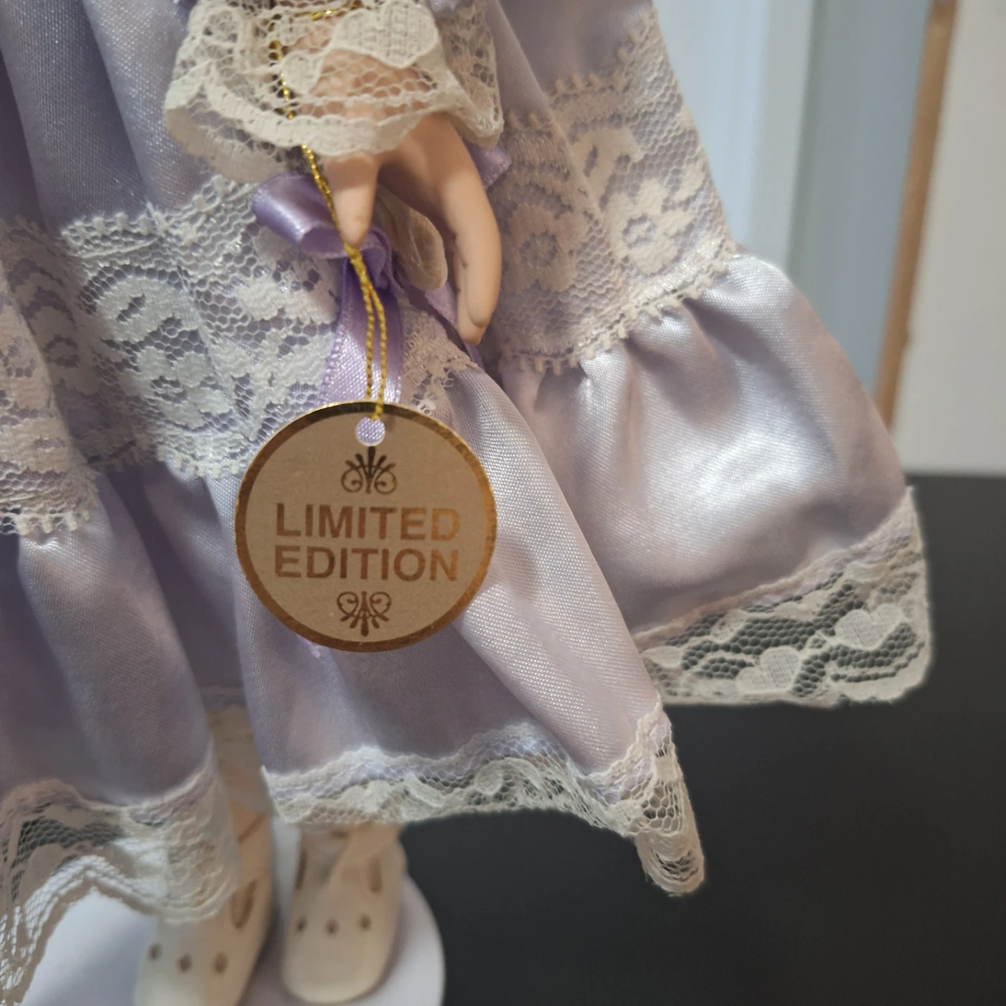 This is a limited edition porcelain doll with blonde curly hair and blue eyes. It's wearing a lovely lavender dress with lace trim. The doll stands on a white display base.