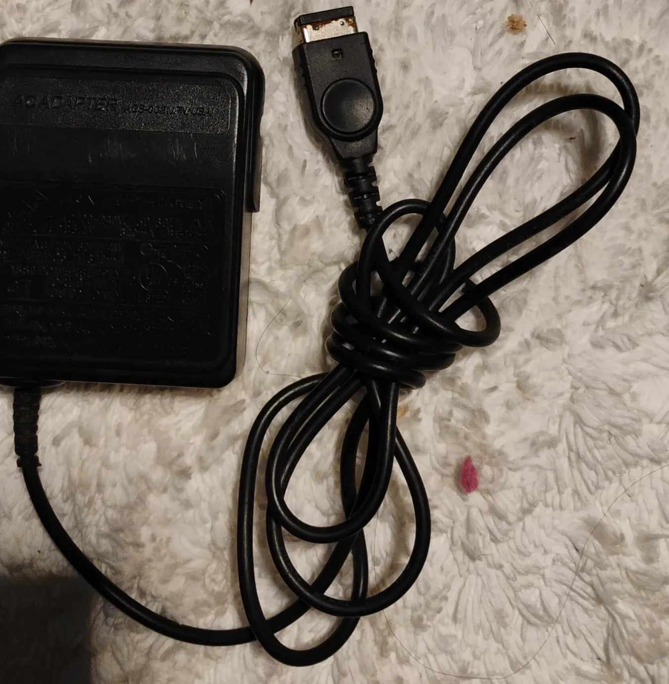 This is a black AC adapter for the Nintendo Game Boy Advance SP. It's a genuine charger and comes with the power cord. This adapter is designed for use with the GBA SP.