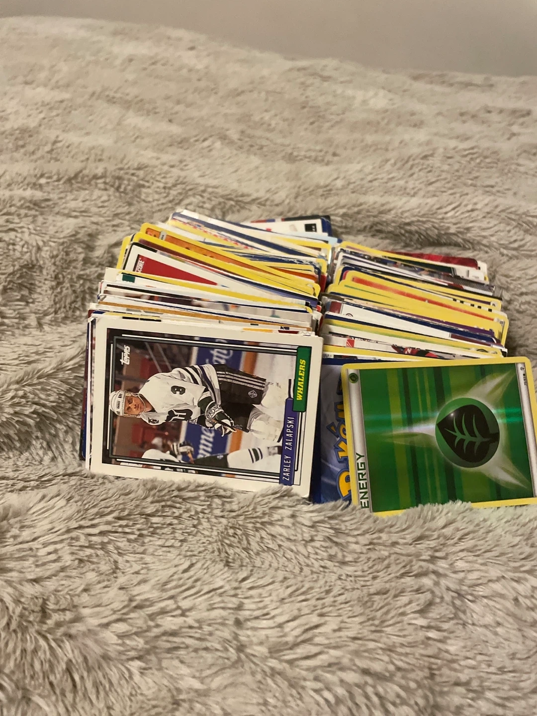 A stack of assorted hockey cards featuring players like Zarley Zalapski. It also includes Pokémon energy cards. Great for collectors!
