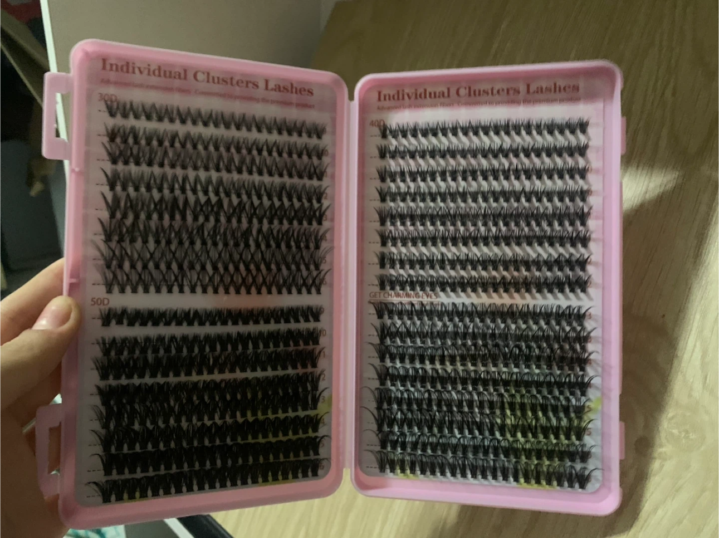 Individual clusters lashes with advanced extension fibers. Available in 30D, 40D, and 50D for a customized look. These lashes come in a convenient pink case.