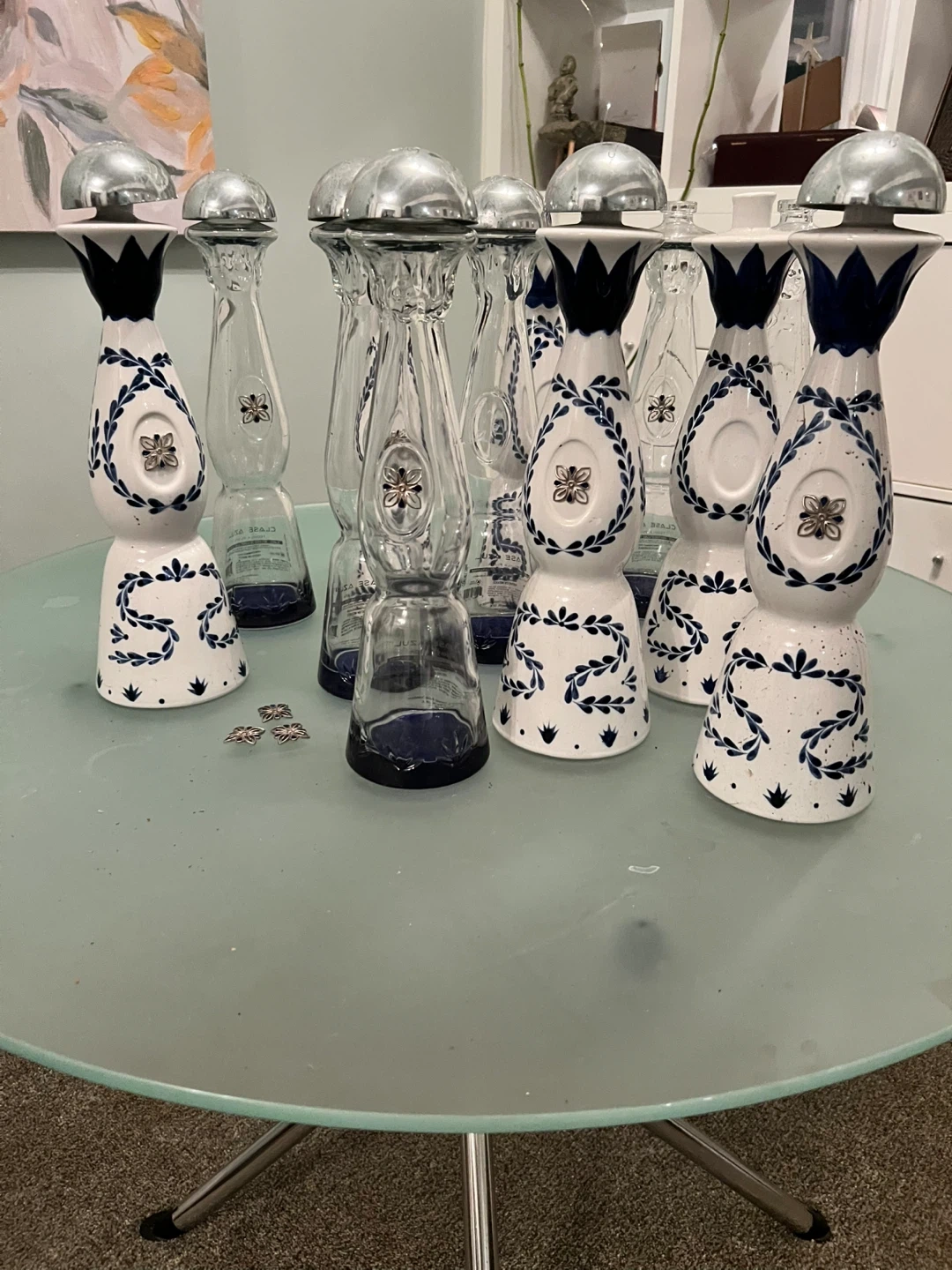 Decorative bottles with white and blue floral designs. Each bottle features a silver cap. These are empty bottles, perfect for display or repurposing. They're ideal for home decor or craft projects.