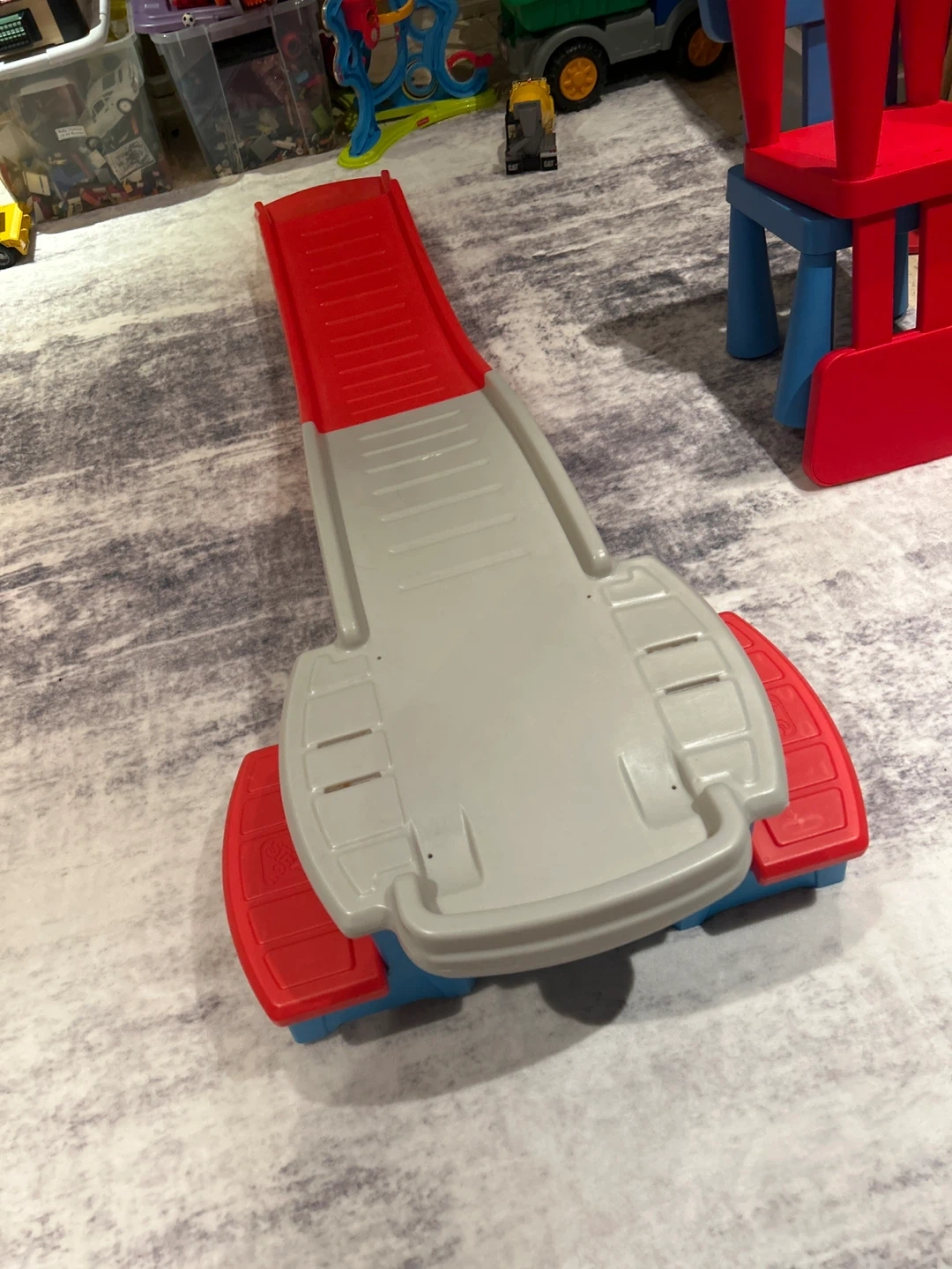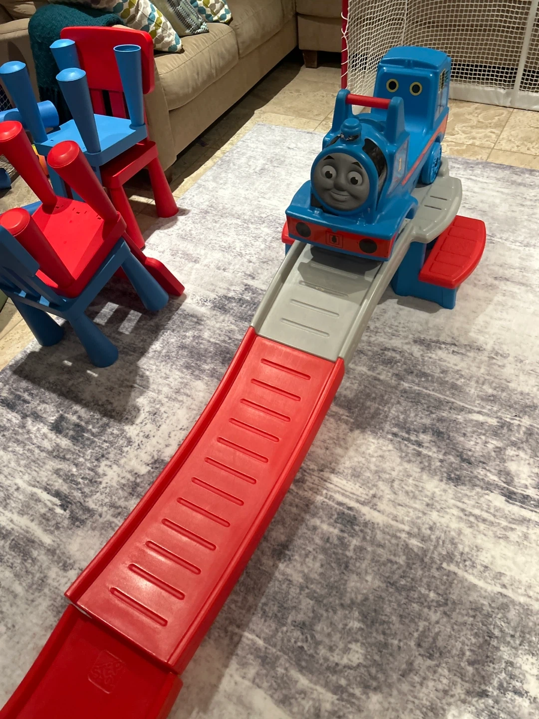It's a fun ride-on toy featuring Thomas the Tank Engine! Kids can slide down the red track after riding Thomas. Made of durable plastic.