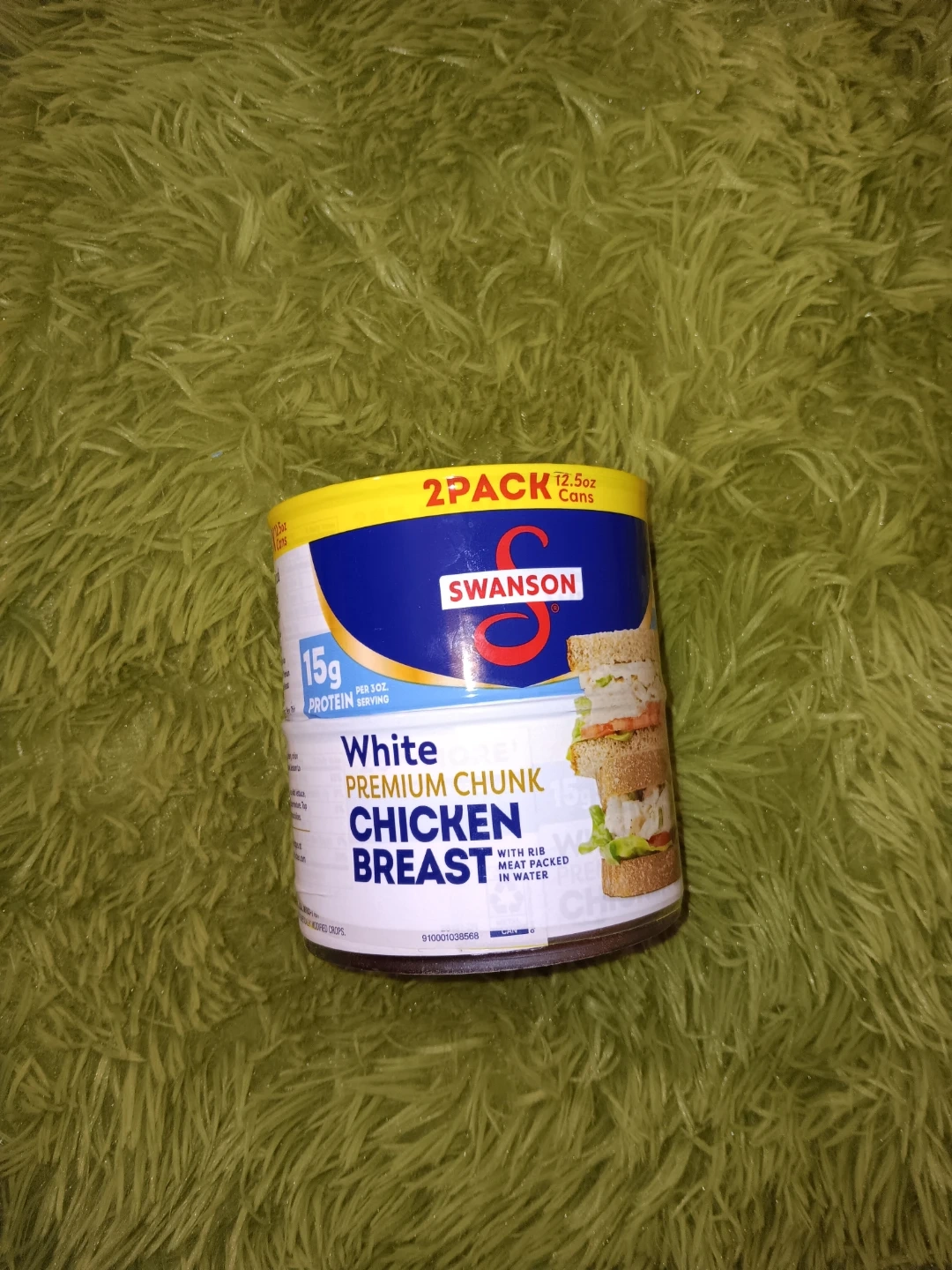 This is a 2-pack of Swanson White Premium Chunk Chicken Breast. Each can is 12.5oz and contains 15g of protein per 3oz serving. The chicken is packed with rib meat in water.