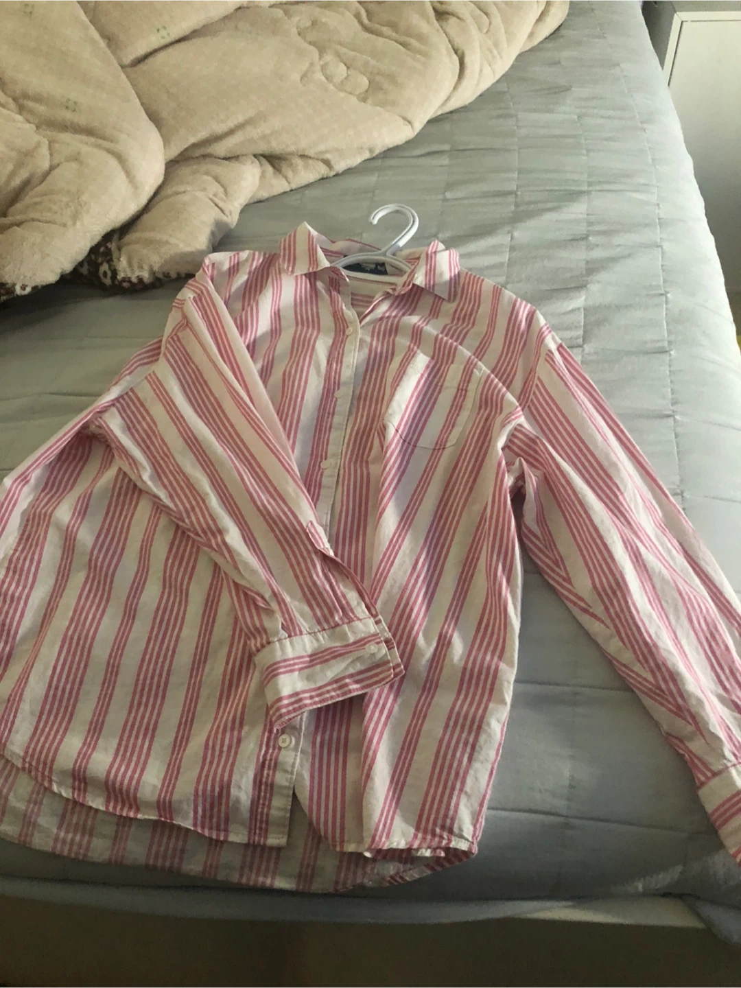 A classic button-up shirt with a pink and white stripe pattern. It features a collared neckline and long sleeves. This shirt is made of lightweight fabric.