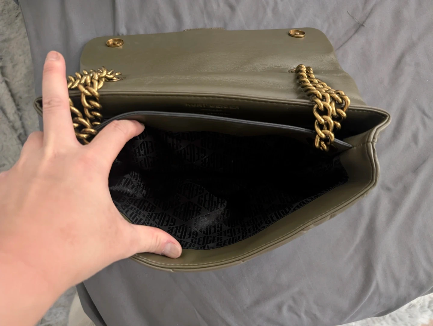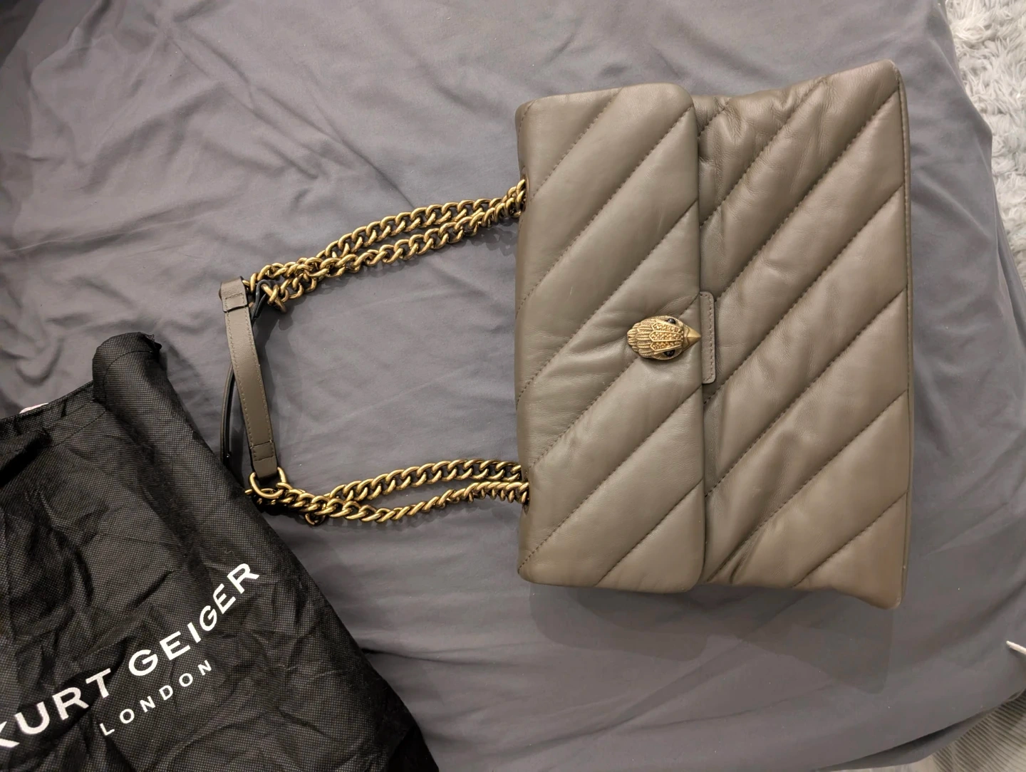 A stylish quilted leather shoulder bag from Kurt Geiger London. It features a gold-tone chain strap and the brand's signature eagle clasp. Includes the original dust bag.