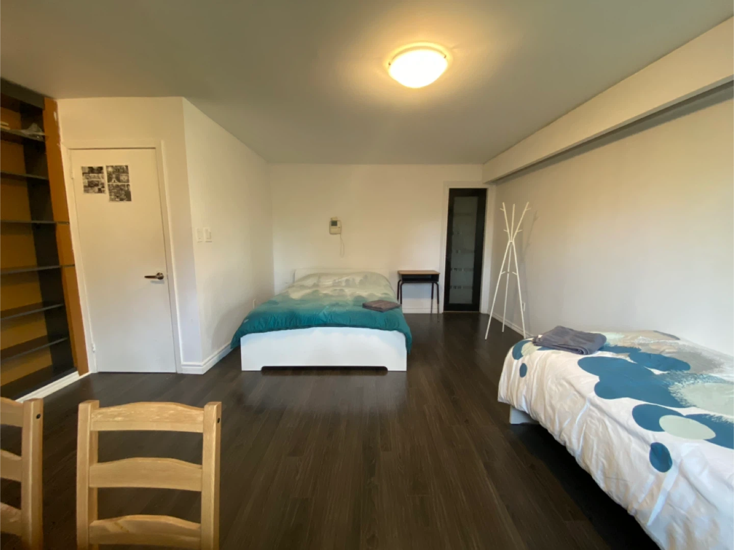 This listing is a master bedroom featuring two separate beds, 1 queen size bed and 1 twin size . Dining table and an en-suite bathroom.