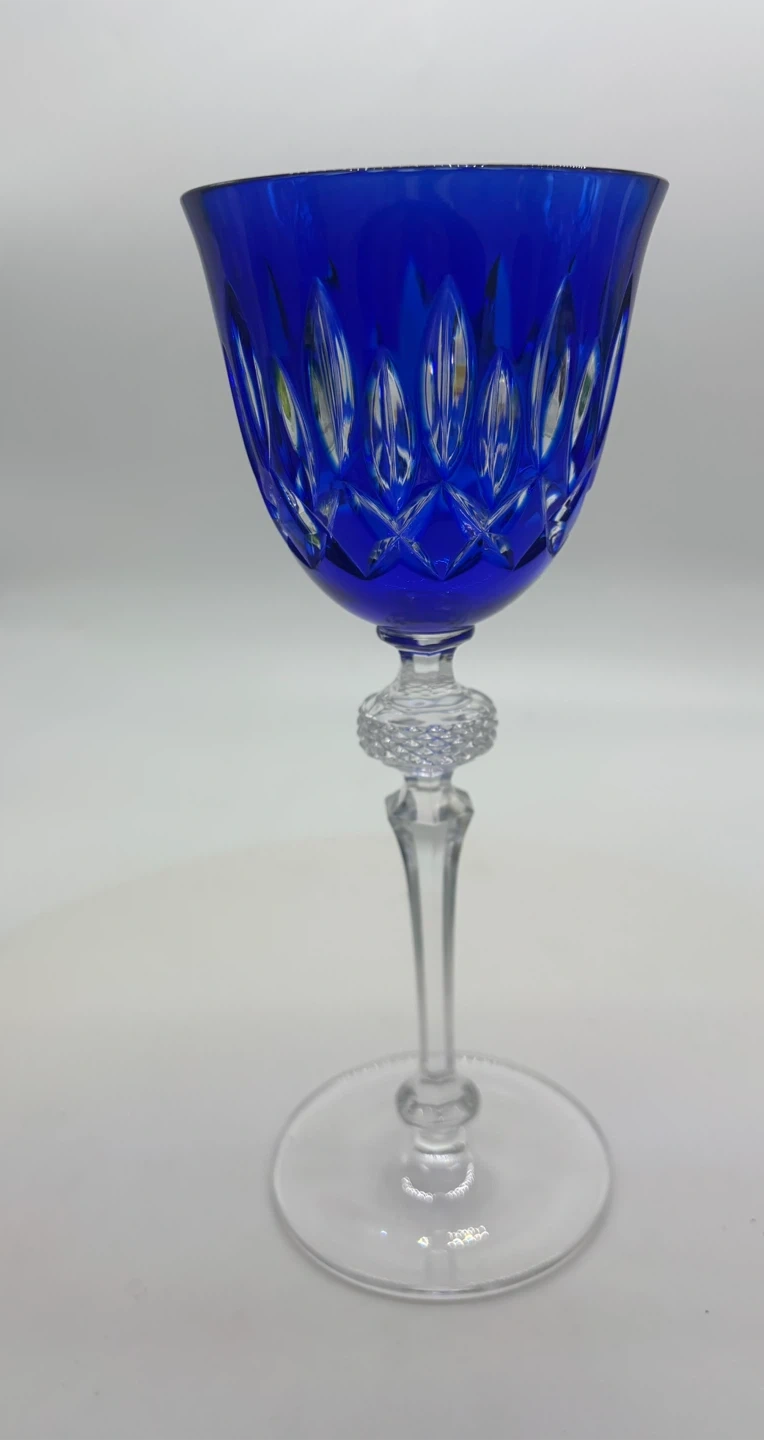 A lovely set of twelve wine glasses in various vibrant colours. Each glass is made of cut to clear crystal. They have a detailed glass stem with a textured band.