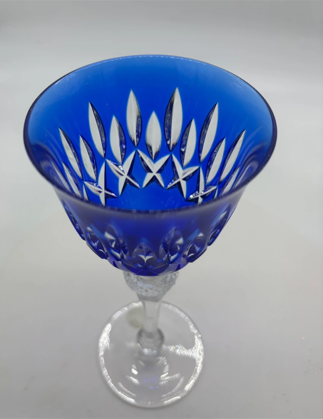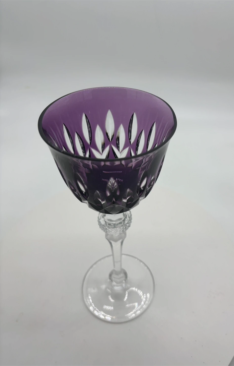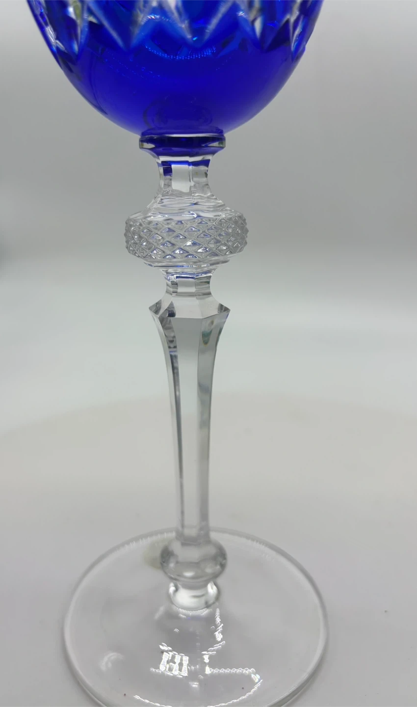 Cut to clear Bohemian Czech crystal wine glasses. Two cobalt blue, three emerald green, two lime green, two amethyst, two ruby red, one amber.