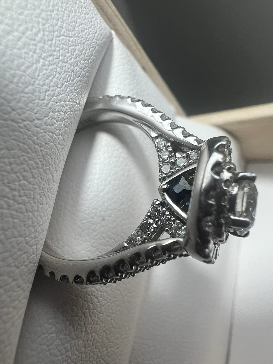 Beautiful engagement ring crafted from 14K white gold and diamonds .