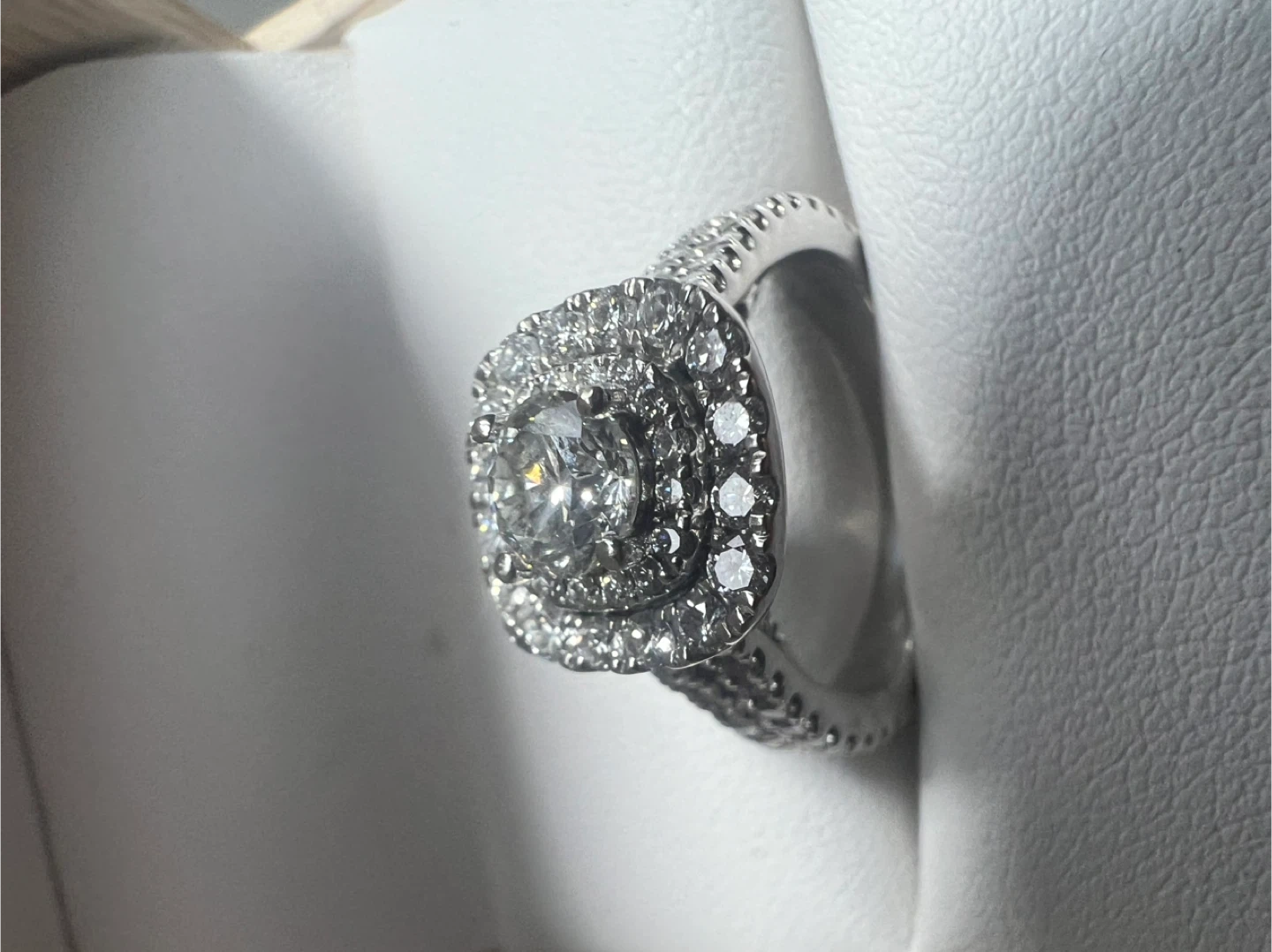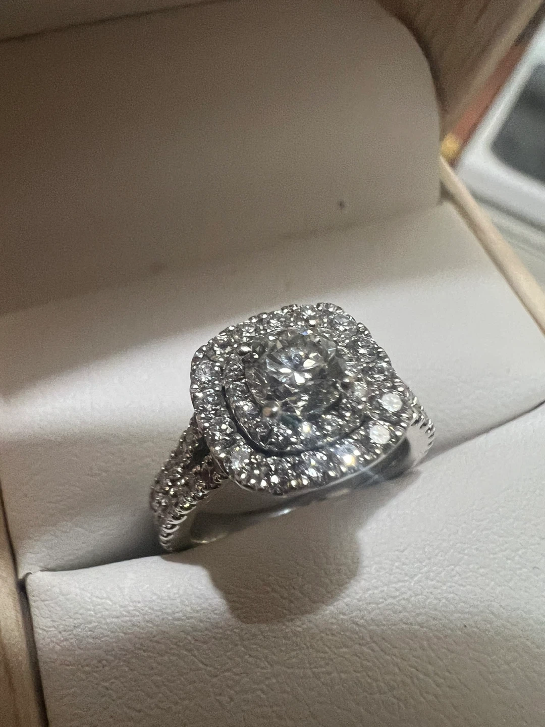 Centre diamond -0.46 carat . It's set with a central diamond surrounded by a double halo of smaller diamonds. The band also features sparkling accent stones.
