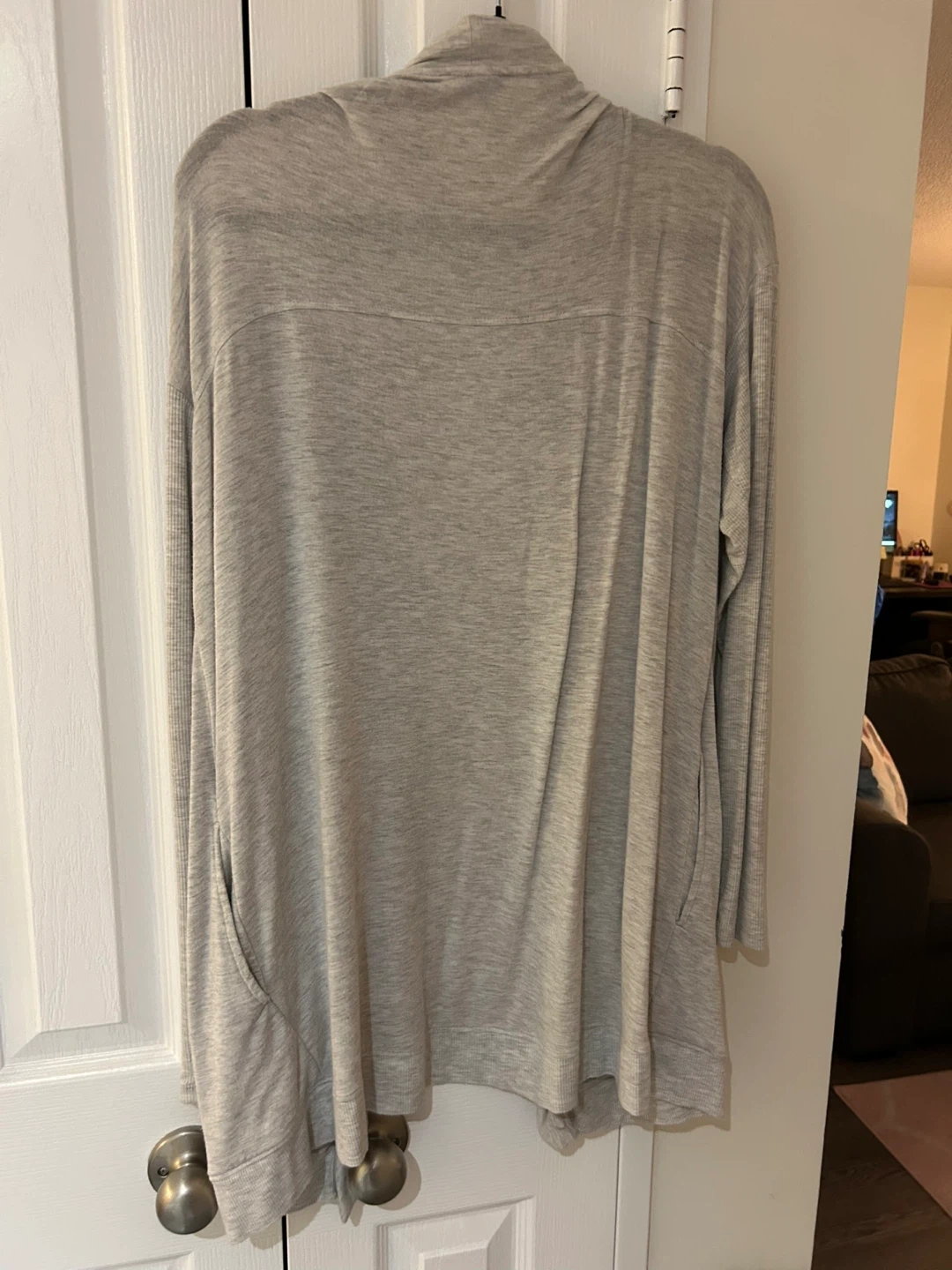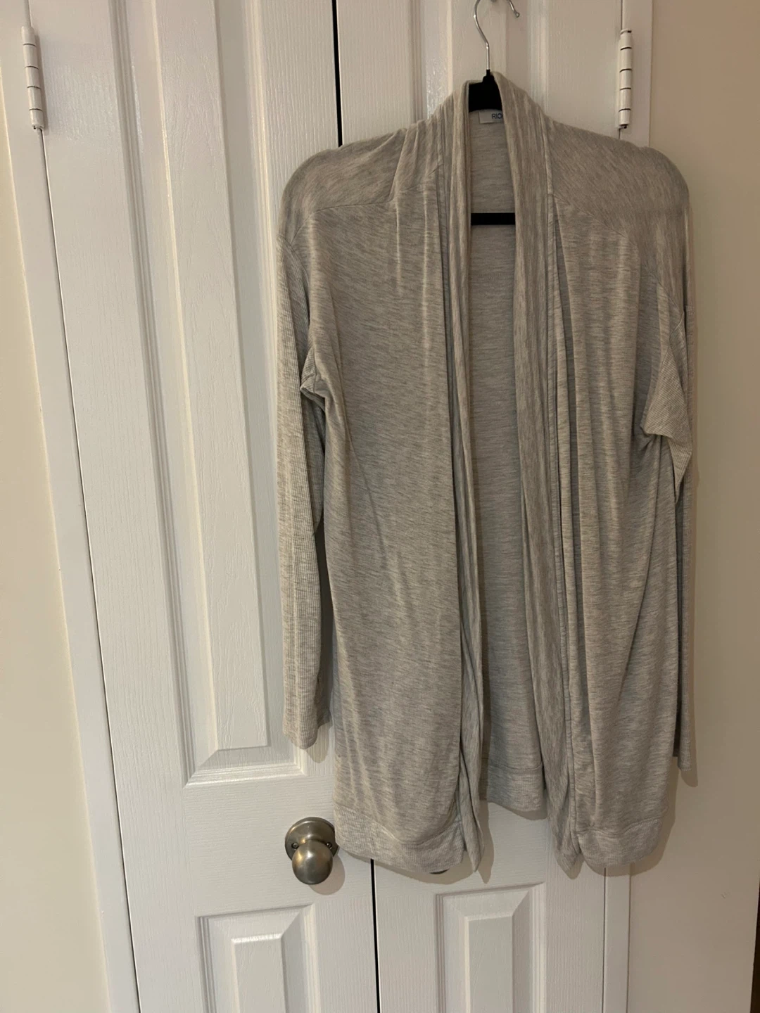 Grey Ricki’s Open Cardigan, has thumb holes.