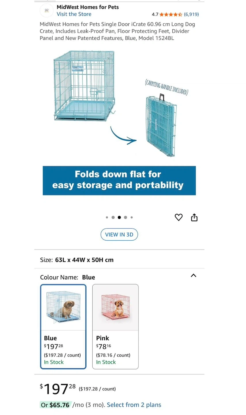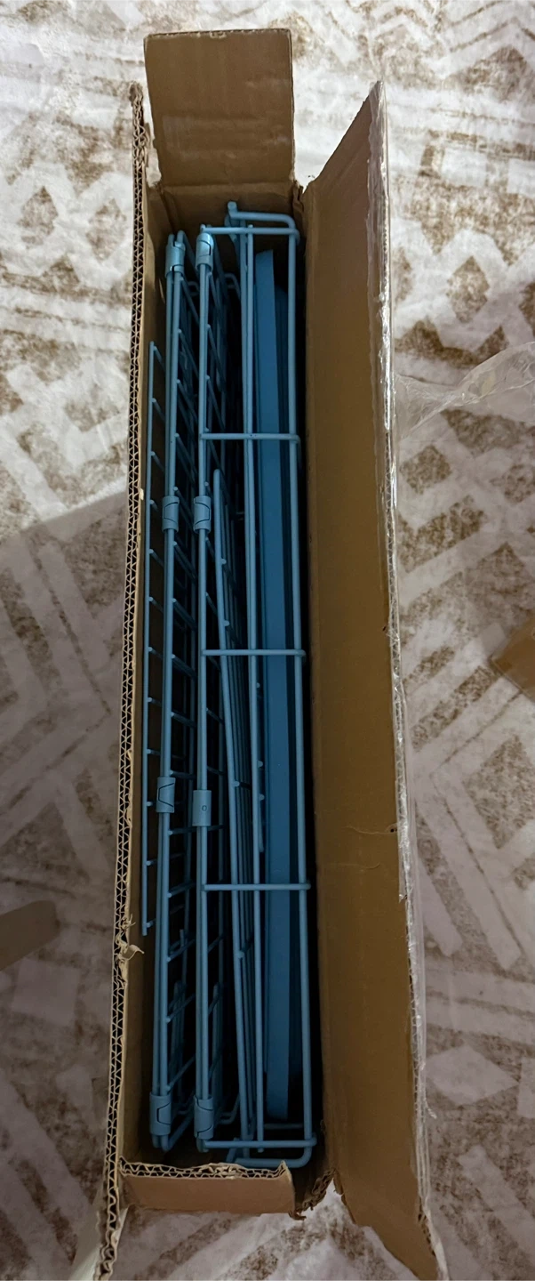 This is a blue Midwest Homes for Pets iCrate, 60.96 cm long. It folds down flat for easy storage and portability. It includes a leak-proof pan and floor protecting feet.
