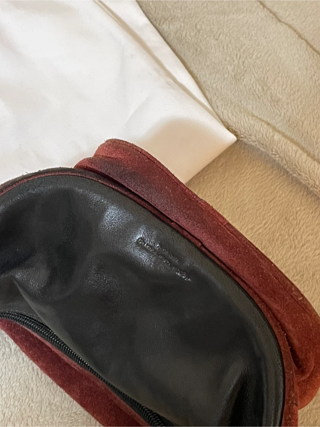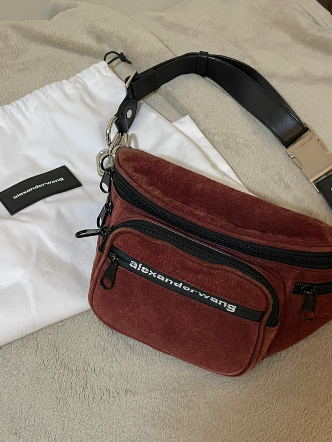 Alexander Wang belt bag burgundy suede and black leather. It has multiple zippered compartments for storage. Includes original dust bag.