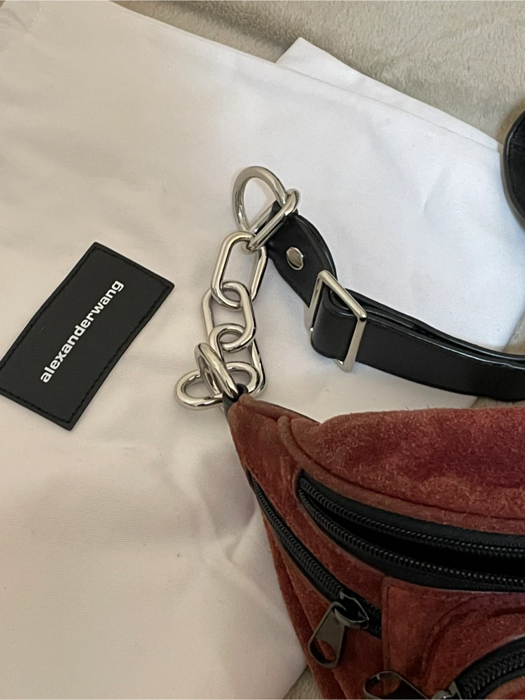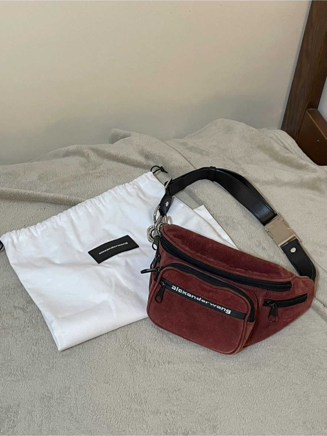 Alexander Wang belt bag burgundy suede and black leather. It has multiple zippered compartments for storage. Includes original dust bag.