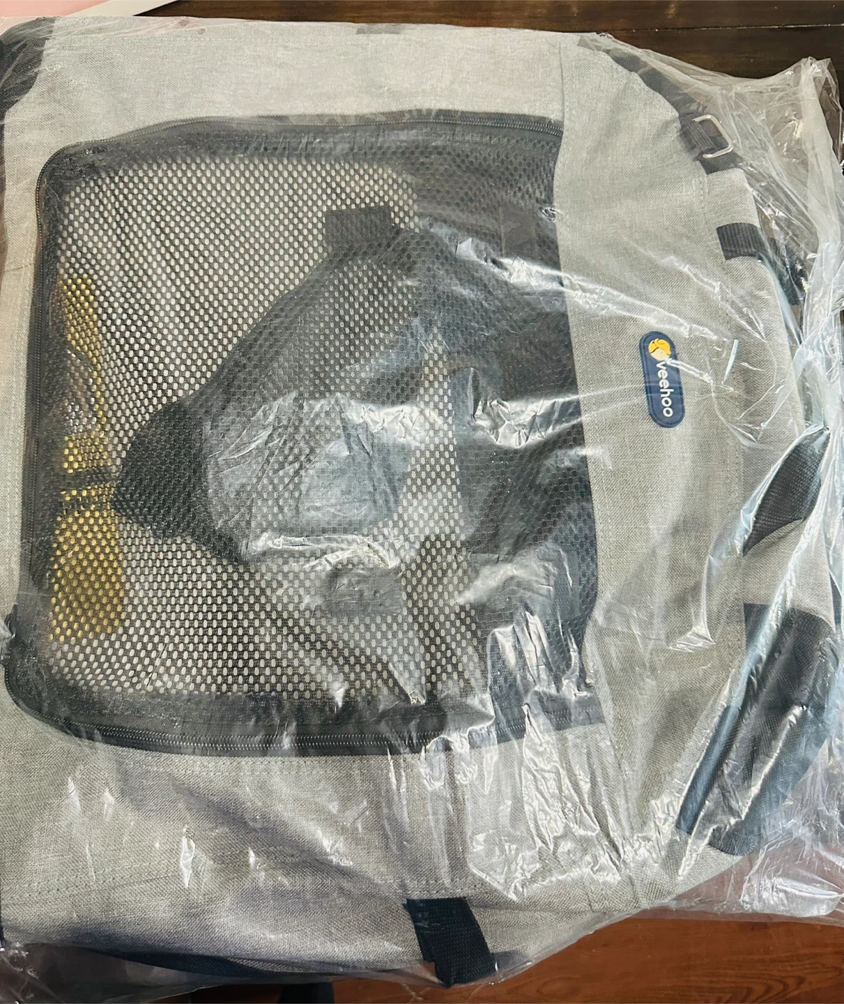 This Veehoo dog crate is gray. It's made with waterproof Oxford fabric and features a non-slip soft pad, solid steel frame, and convenient carrying handles. This crate is useful for safely transporting or housing pets.