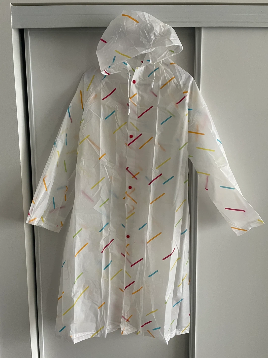 3 clear unisex japanese-style ponchos featuring fun pattern of multi-coloured stripes are available. They have a hood and red button closures down the front. They are a stylish alternative to regular ponchos. They are made with sturdy material, making them resistant to tears.