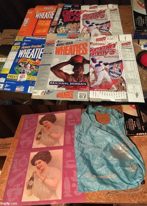 - 6x Sports Cereal Boxes (Slammin Sammy's, Grand Slams, Wheaties Picture Frame Jordan - some bends, Grand Slams have a couple on top)