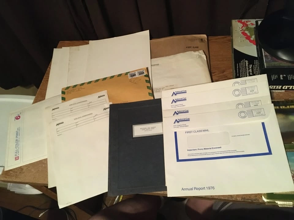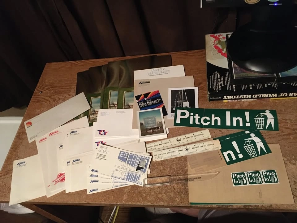 - National Can Corporation Lot: 14 bags, 5 folders, 30 envelopes (various sizes, new), 9 Christmas cards, 7 "We've Moved" cards, 3 bumper stickers, sticker sheet, 1 large sticker, 2 company/event pictures, 3 rulers, 2 cards, 2 magazines, company info (70s/80s). Some discoloring/wear on bags and folders.