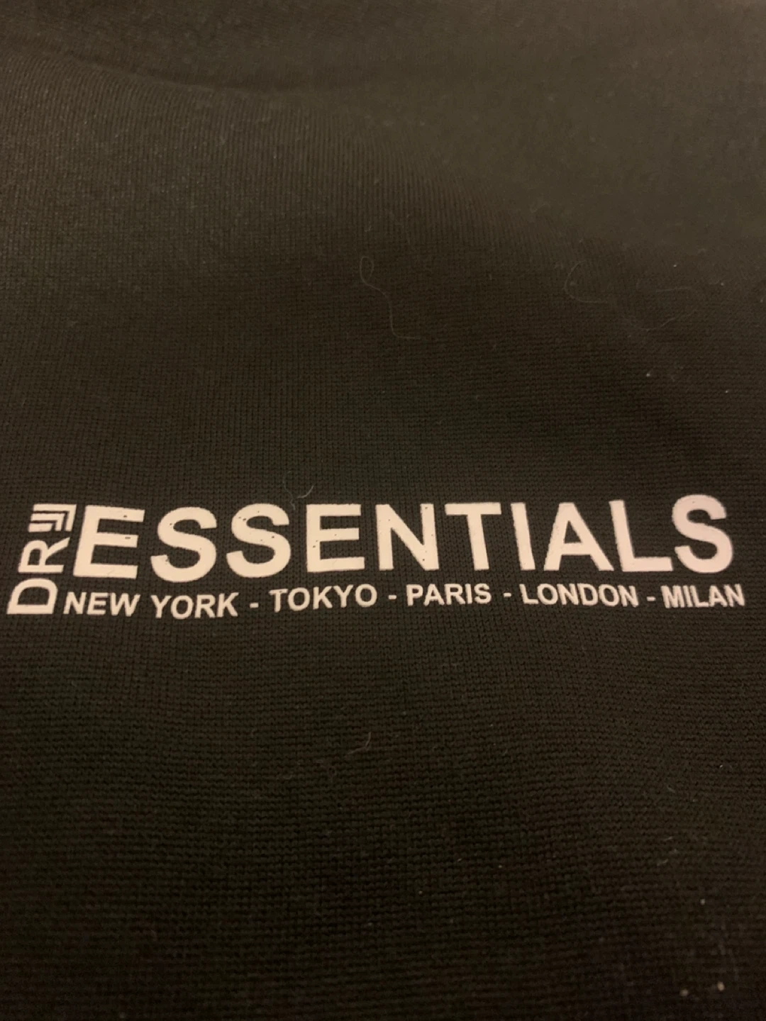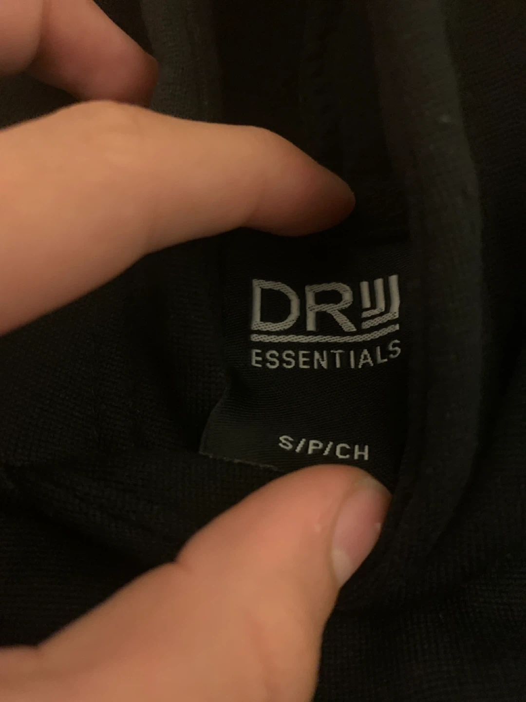 This is a black DRW Essentials hoodie. It's size S/CH and made from a soft material. A great layering piece for cooler weather!