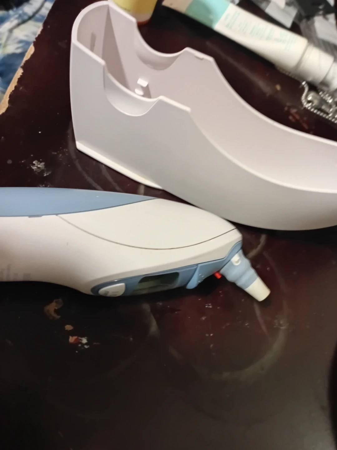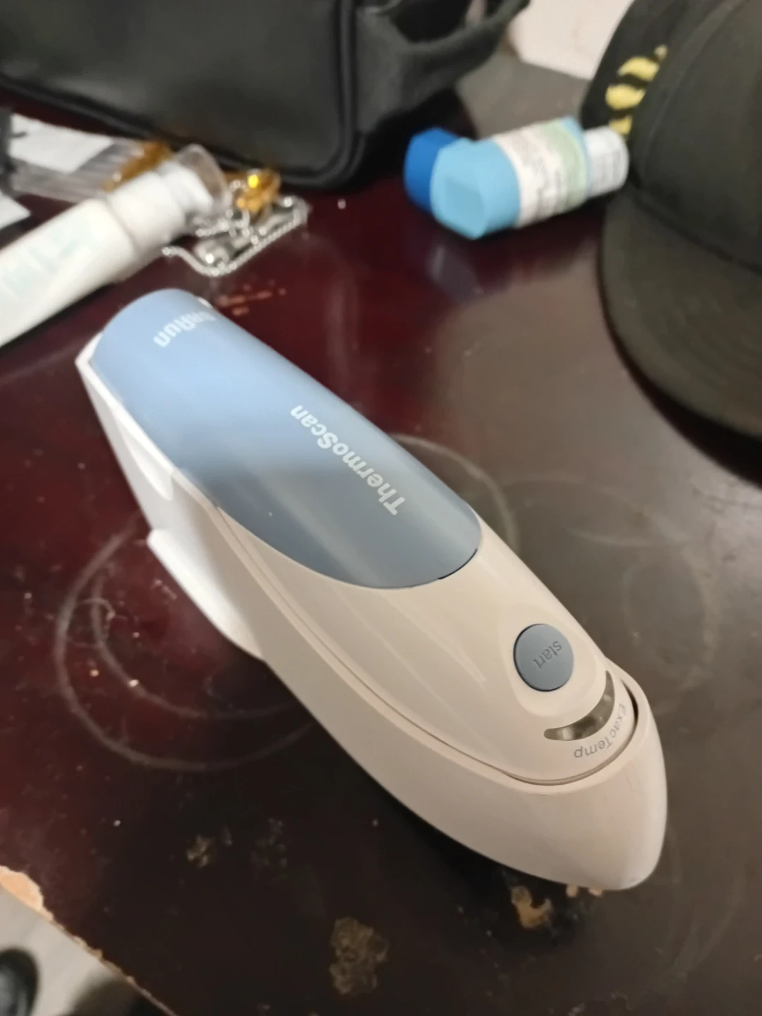 Braun ThermoScan ear thermometer for quick temperature readings. It has a blue and white design and comes with its protective case. It's easy to use with a start button.