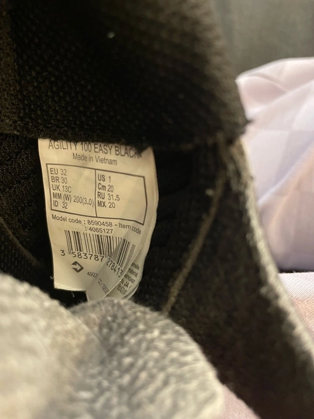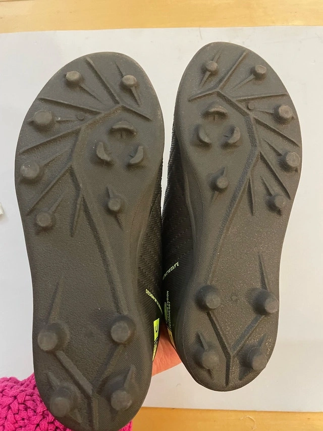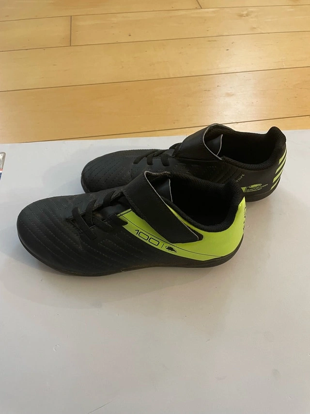 These are Kipsta soccer shoes, perfect for young athletes. They are used but in fair condition and ready for the field! They are black with neon green accents. They are size US 1 (20cm).