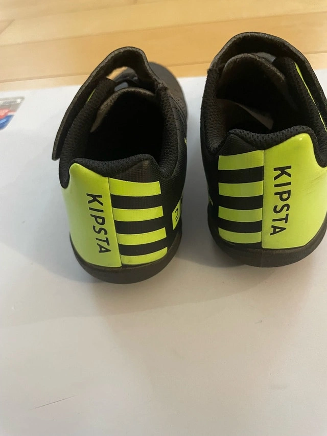 These are Kipsta soccer shoes, perfect for young athletes. They are used but in fair condition and ready for the field! They are black with neon green accents. They are size US 1 (20cm).