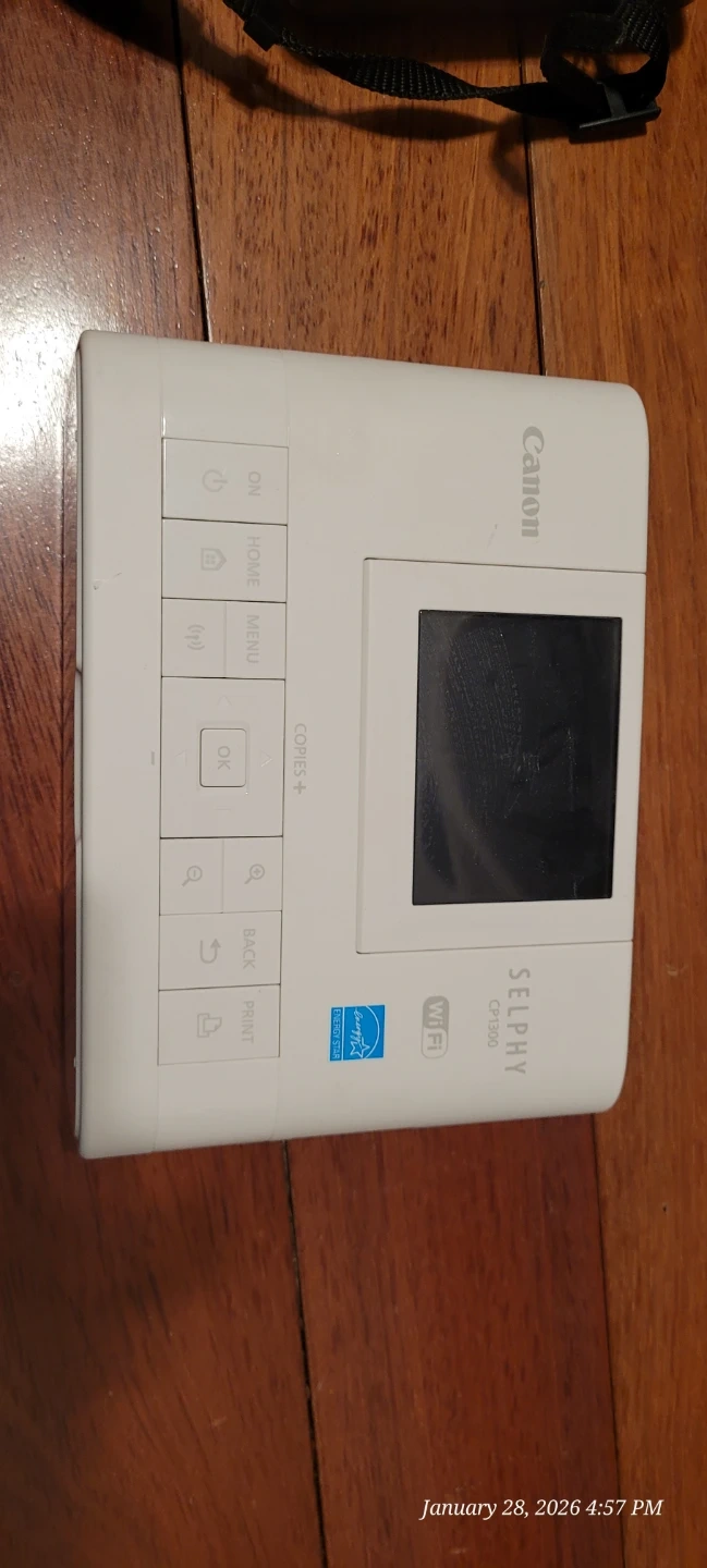 This is a white Canon SELPHY CP1300 compact photo printer. It has Wi-Fi connectivity and is Energy Star certified. It's a portable device for printing photos.