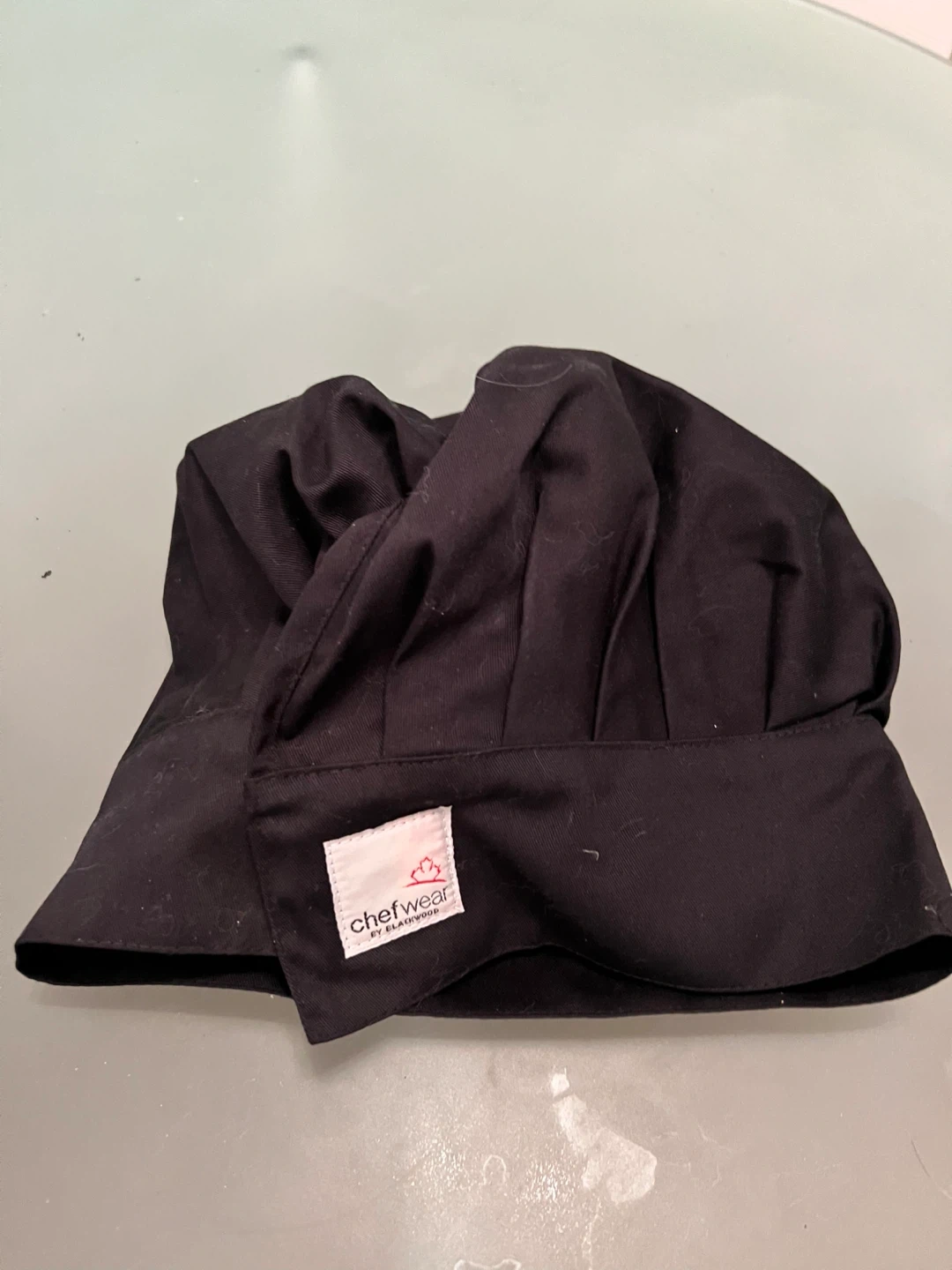 This is a black Chefwear toque hat, size large. It's made of a 65% polyester and 35% cotton blend. This hat is suitable for kitchen staff or culinary students.